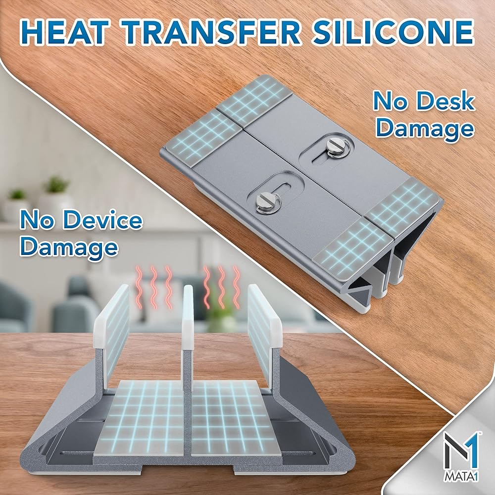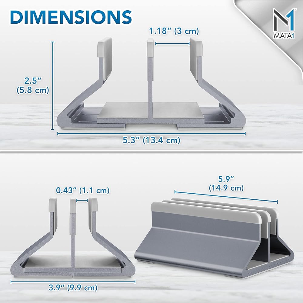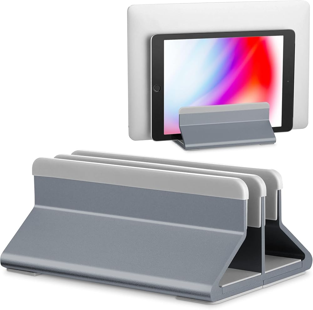 حامل كمبيوتر محمول عمودي (رمادي)، ألومنيوم بدرجة الطيران وليس بلاستيك ABS لتبديد الحرارة وحماية أجهزتك، قابل للتعديل مع حلقات قفل وقاعدة مضادة للانزلاق متوافقة مع جميع الأجهزة مقاس 7-17.3 بوصة