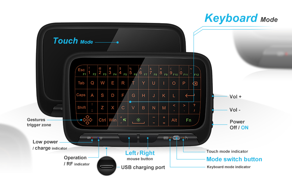 ✅لوحة مفاتيح صغيرة ذات وضعين: تحتوي لوحة المفاتيح اللاسلكية هذه على وضعين، وضع لوحة اللمس ووضع لوحة المفاتيح. يمكنك استخدامها كلوحة لمس أو لوحة مفاتيح في أي وقت باستخدام زر تبديل الوضع.