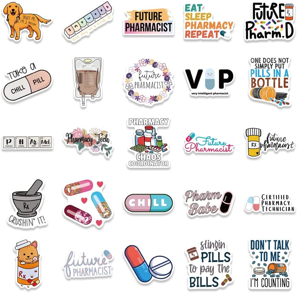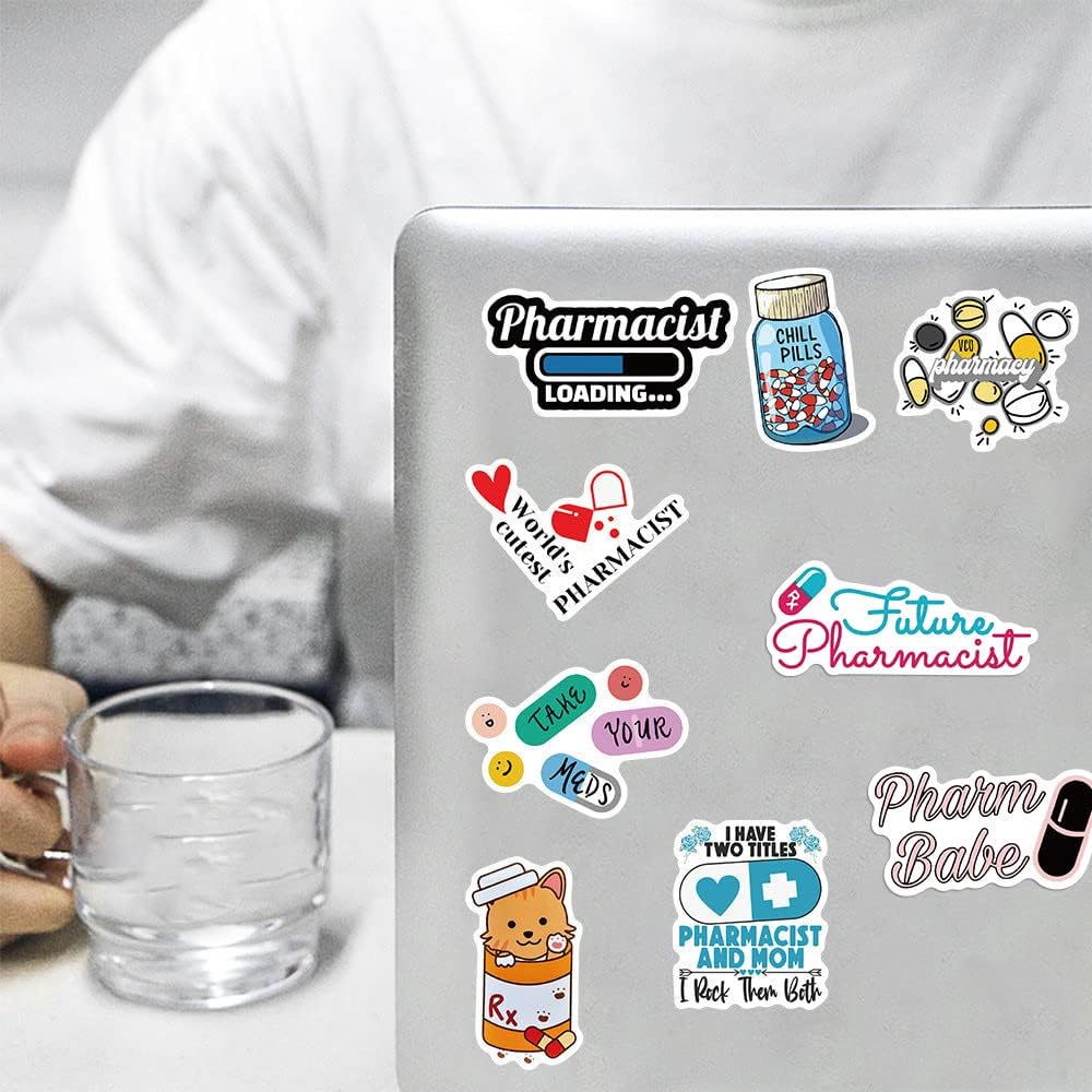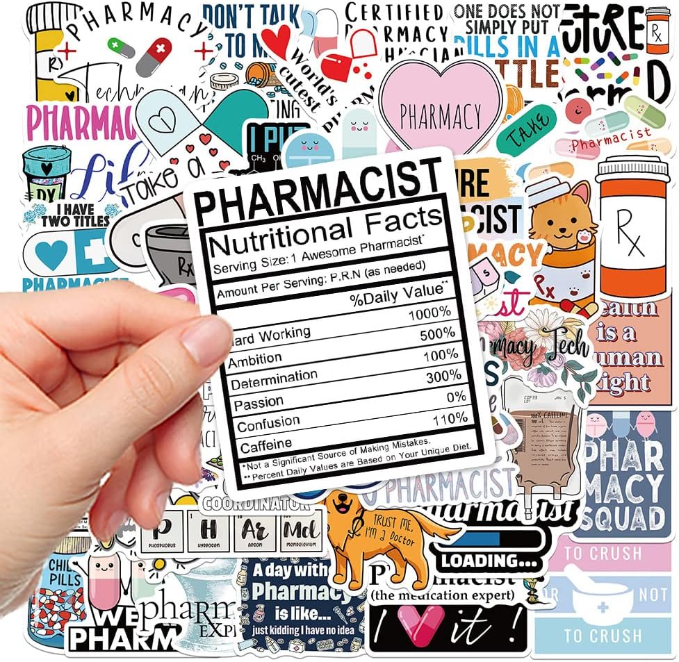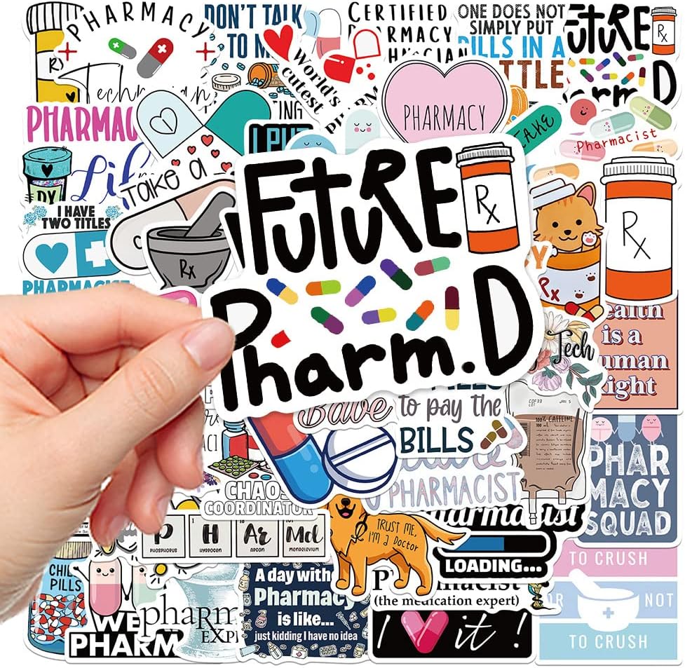 ملصقات صيدلانية، 50 قطعة من ملصقات فينيل مقاومة للماء لزجاجات المياه واللابتوب والقبعة الصلبة والامتعة والسيارة وهدايا للنساء والرجال وزملاء العمل او طلاب التخرج