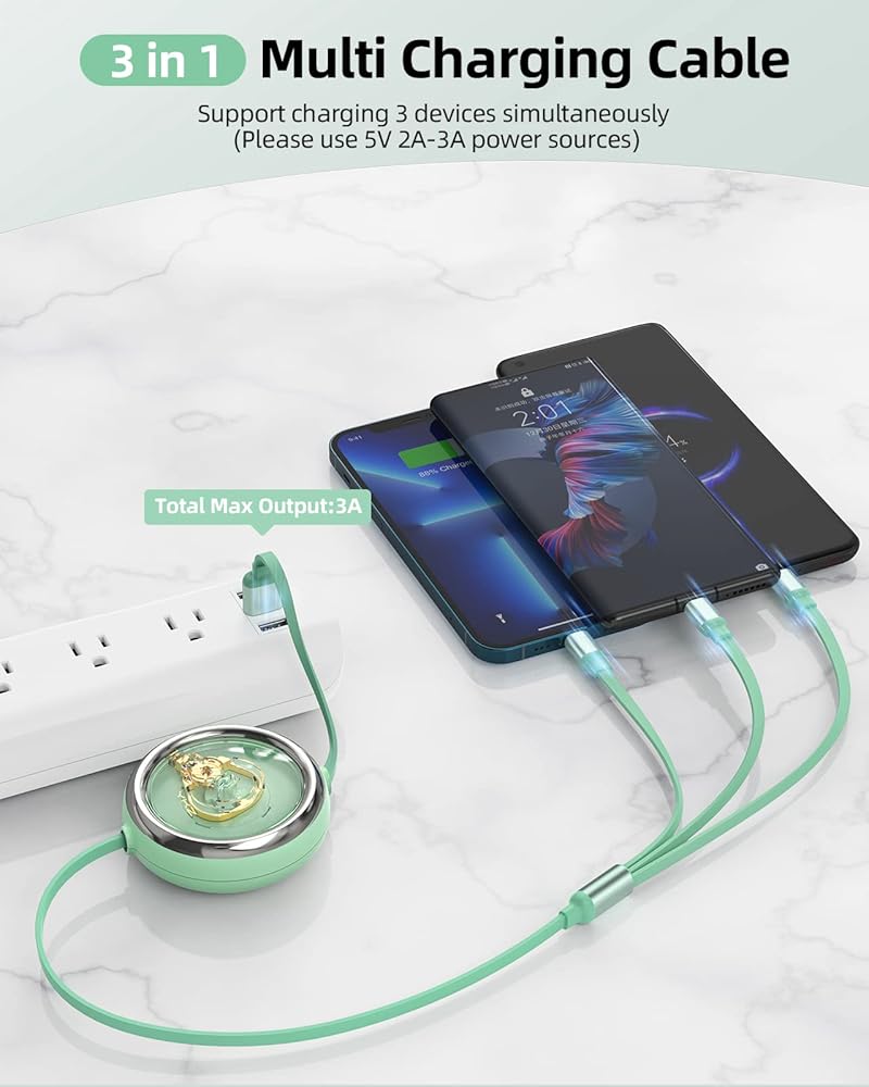 3 in 1 Multi Charging Cable - YKZ Multi Charger cord with USB-C, Micro USB and IP Connectors. One cable meets almost all needs of charging. Retractable design compact to carry, No need to prepare or carry more charger cables anymore, One for All, Ideal for car driving, business trips, office work, travel, etc.
