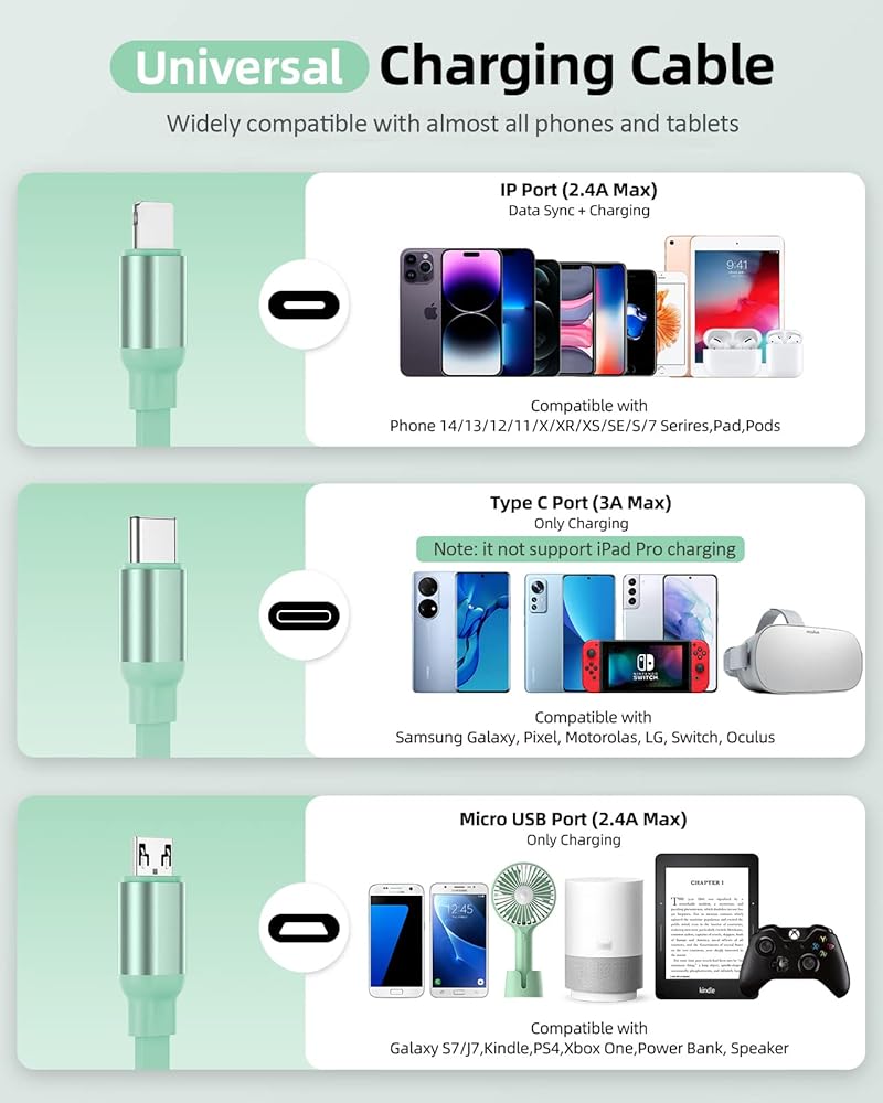 Universal Compatibility - YKZ multi charging cable widely compatible with all smartphones and most mobile devices, "PHONE" Port for Phone 14//13/12/11 Pro Max/11/Xs/Xr/X 8/8 Plus/7/7 Plus/6/6 Plus & Pod/Pad Mini, Air. "Type C" Port for Samsung S22+, S21, Fold Z, Flip, S10, Note 20, etc. "Micro USB" Port for Samsung Galaxy j7, S7, S6 most Androids phones & wireless accessories, etc.