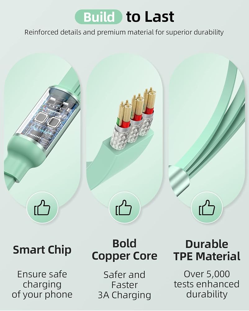 Safe & Durable - Adopted pure copper wire and smart chip to lower resistance, ensures safe charging and protects your devices. High elastic flat TPE material for extreme durability and flexibility, which endures more than 10,000 tensile tests without worrying about getting stuck.