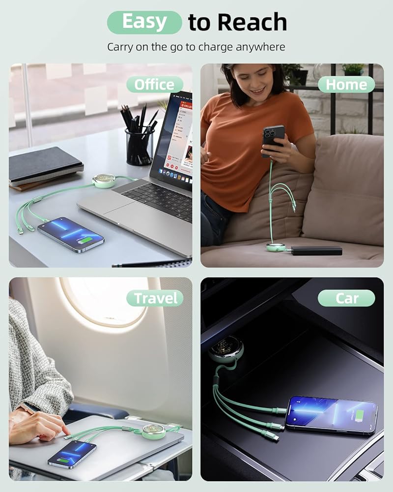 YKZ Multi Charger cord with retractable USB-C, Micro USB and IP Connectors. One cable meets almost all needs of charging. Retractable design compact to carry, No need to prepare or carry more charger cables anymore, One for All, Ideal for car driving, business trips, office work, travel, etc.