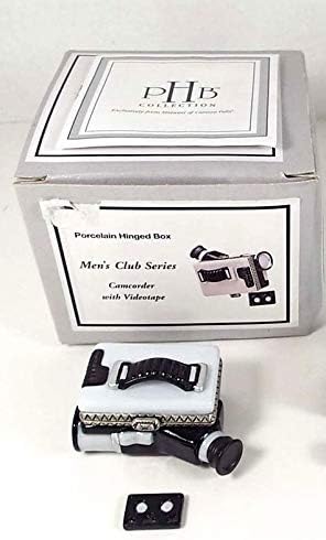 صندوق حلية سيراميك مصغر. يبلغ طولها حوالي 2 انش. تفتح لتكشف عن حجرة سرية مع حلية شريط في اتش اس مصغرة داخل جزء من مجموعة صناديق البورسلين المفصلية من ميدويست اوف كانون فولز (بي اتش بي) هذه ليست كاميرا حقيقية