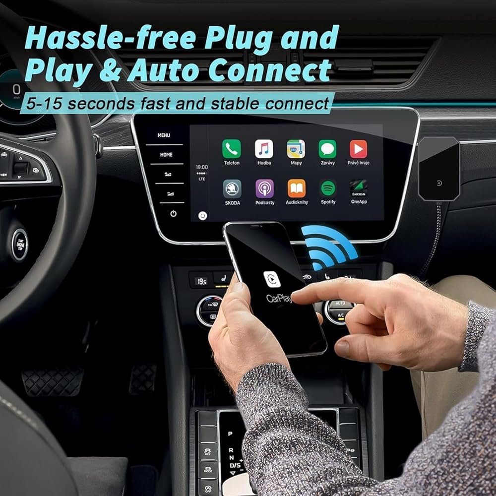إعداد سهل، تصميم مضغوط: تم تصميم محول Carplay اللاسلكي الخاص بنا ليتناسب بسلاسة مع الجزء الداخلي لسيارتك. يشغل تصميمه الأنيق والمدمج مساحة صغيرة مع تقليل فوضى الكابلات. ما عليك سوى توصيله، وفي غضون ثوانٍ، يصبح هاتفك وسيارتك قوة متزامنة تمامًا.