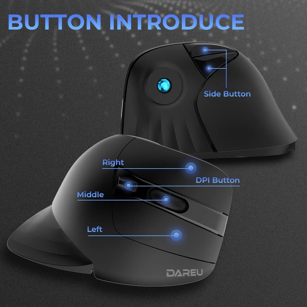 • 【تصميم علمي مريح وخفيف الوزن】استخدم ماوس DAREU اللاسلكي العمودي الفريد لوضع يدك في وضع المصافحة الطبيعي لمنع التواء الساعد وتقليل إجهاد العضلات. 117*75*67.5 ملم، 89 جرام (لا يشمل البطارية)