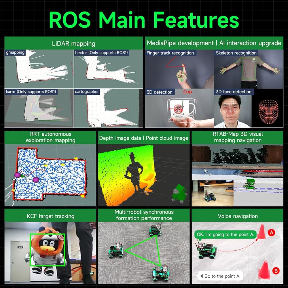 • ربط متعدد المنصات: يدعم rosmaster X3 مجموعة متنوعة من طرق التحكم عن بعد مثل تطبيق الهاتف المحمول، والمقبض، ونظام ROS، ولوحة مفاتيح الكمبيوتر، وما إلى ذلك. يمكنه التحكم في سيارة الروبوت الخاصة بك في أي وقت، واستيراد الرمز الخاص بك، وهو روبوت ذكاء اصطناعي الذي يستمع لتعليماتك. ملحوظة: تطبيق Map Navigation يدعم هواتف Android فقط