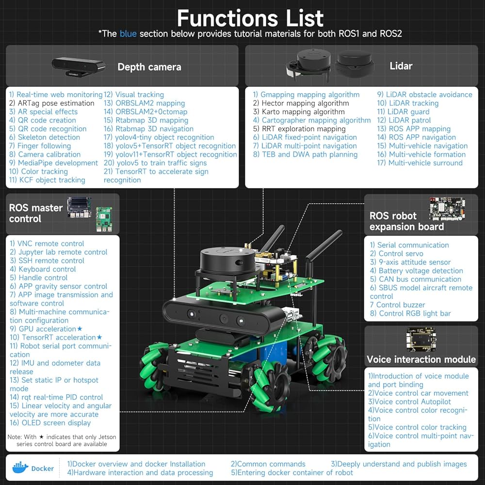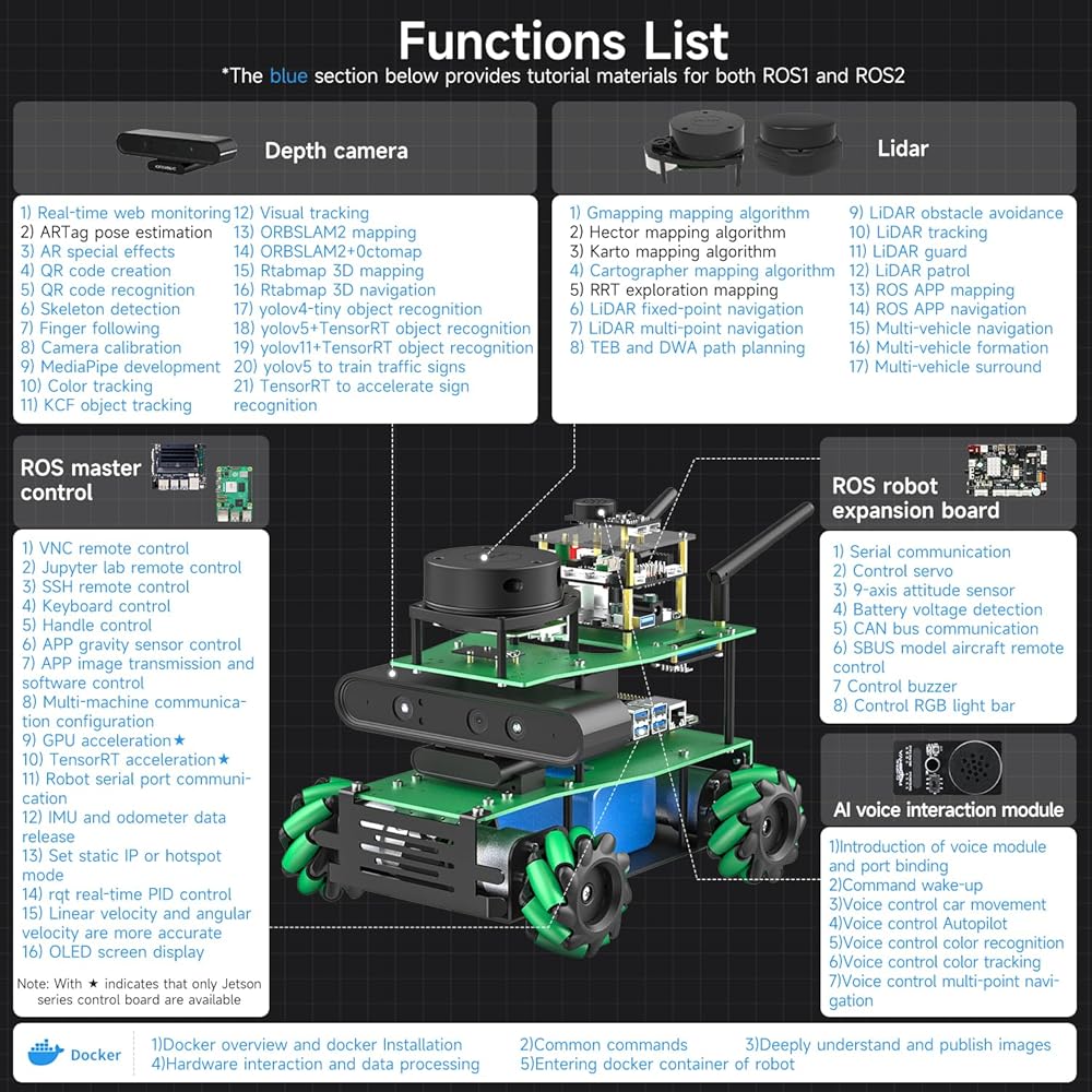 • تكوين ممتاز للأجهزة: هيكل من سبائك الألومنيوم، وعجلات Mecanum متعددة الاتجاهات بزاوية 360 درجة، وكاميرا عمق عالية الجودة، ووحدة تفاعل صوتي اختيارية، ولوحة توسيع مصممة بشكل احترافي. هذا روبوت ROS احترافي يدعم المزيد من التطوير. يمكن للمستخدمين التطوير والتعلم مرة أخرى في الدورات التدريبية الحالية. ملحوظة: يقدم موقع Yahboom المساعدة الفنية للدورات التدريبية الحالية فقط. يجب إكمال جميع عمليات التطوير المتعمقة من قبل العملاء أنفسهم.
