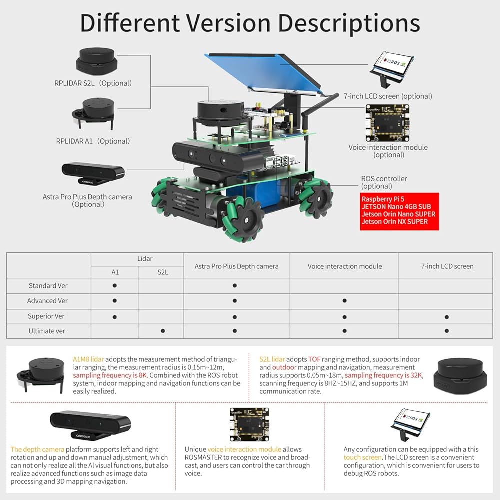 • هام جدًا: جميع ملحقات ROSMASTER X3 التي لا تحتوي على لوحة تطوير مختلفة أيضًا. على سبيل المثال: ROSMASTER X3 بدون Raspberry Pi وROSMASTER X3 بدون Jetson Nano، هناك ملحقات مختلفة فيه، تأكد من لوحة التطوير التي ستستخدمها في المستقبل قبل الطلب.