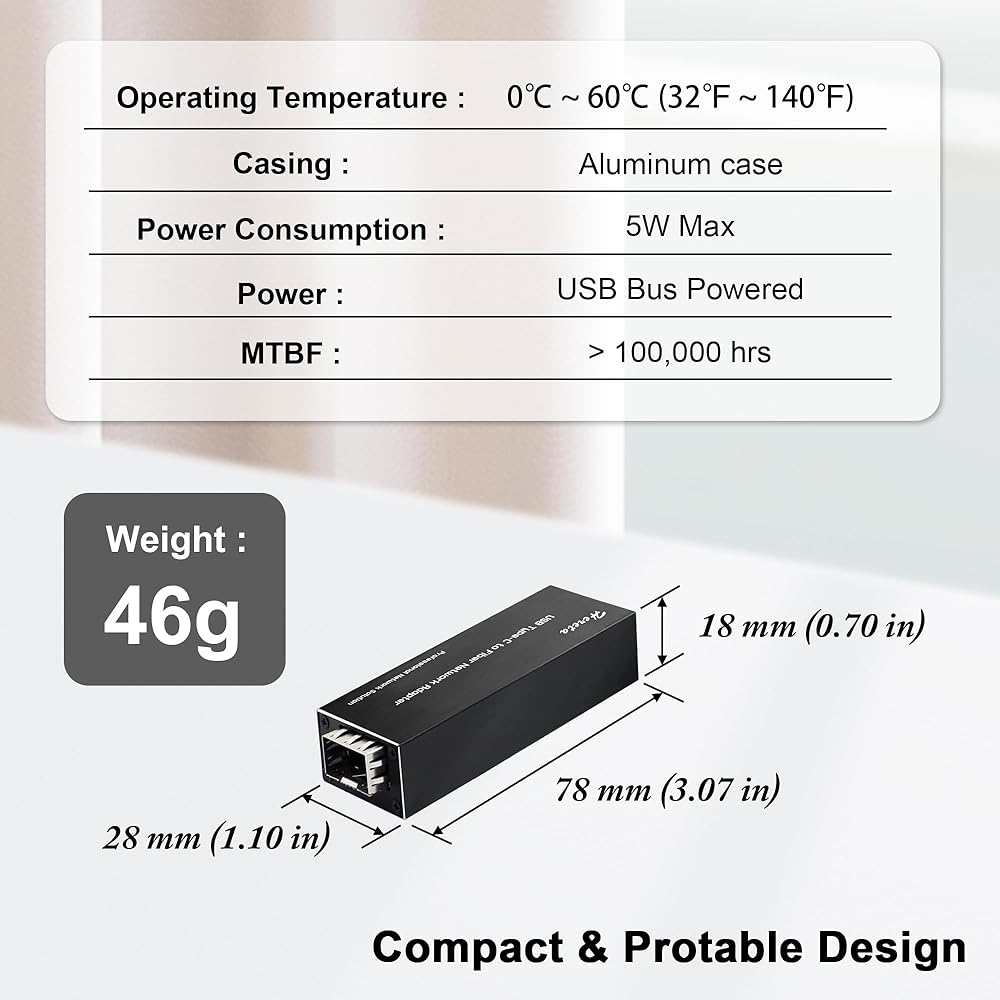 【صغير الحجم ومحمول】يستفيد محول شبكة الألياف هذا من تصميم ألومنيوم مدمج وخفيف الوزن، وتصميم محمول للغاية، دون الحاجة إلى محول طاقة خارجي (يعمل بالحافلة). يمكنك وضعها بسهولة في حقيبة أو جيب، مما يجعلها مثالية لرجال الأعمال