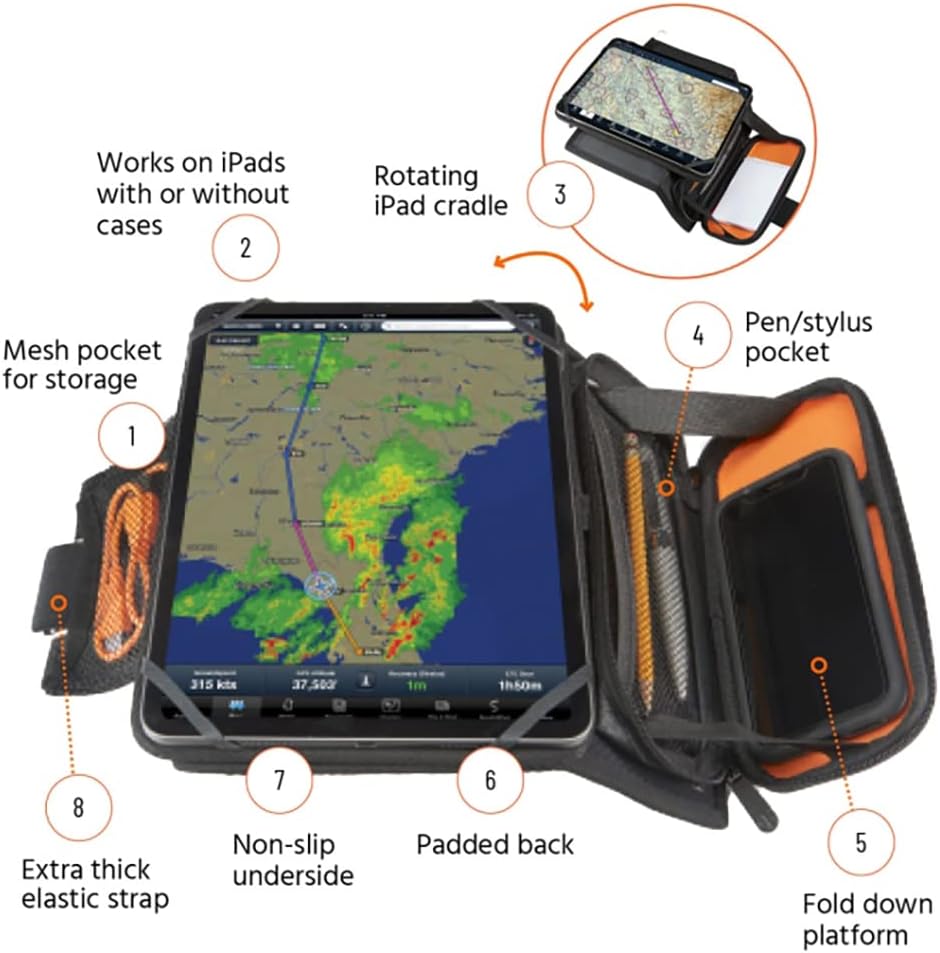 • منصة قابلة للطي - بالإضافة إلى كونها لوح ركبة رائع لجهاز iPad، أضاف الطيارون في Flight Outfitters منصة قابلة للطي إلى جانب ساقك. هذا هو المكان المثالي لحمل جهاز iPhone أو المفكرة