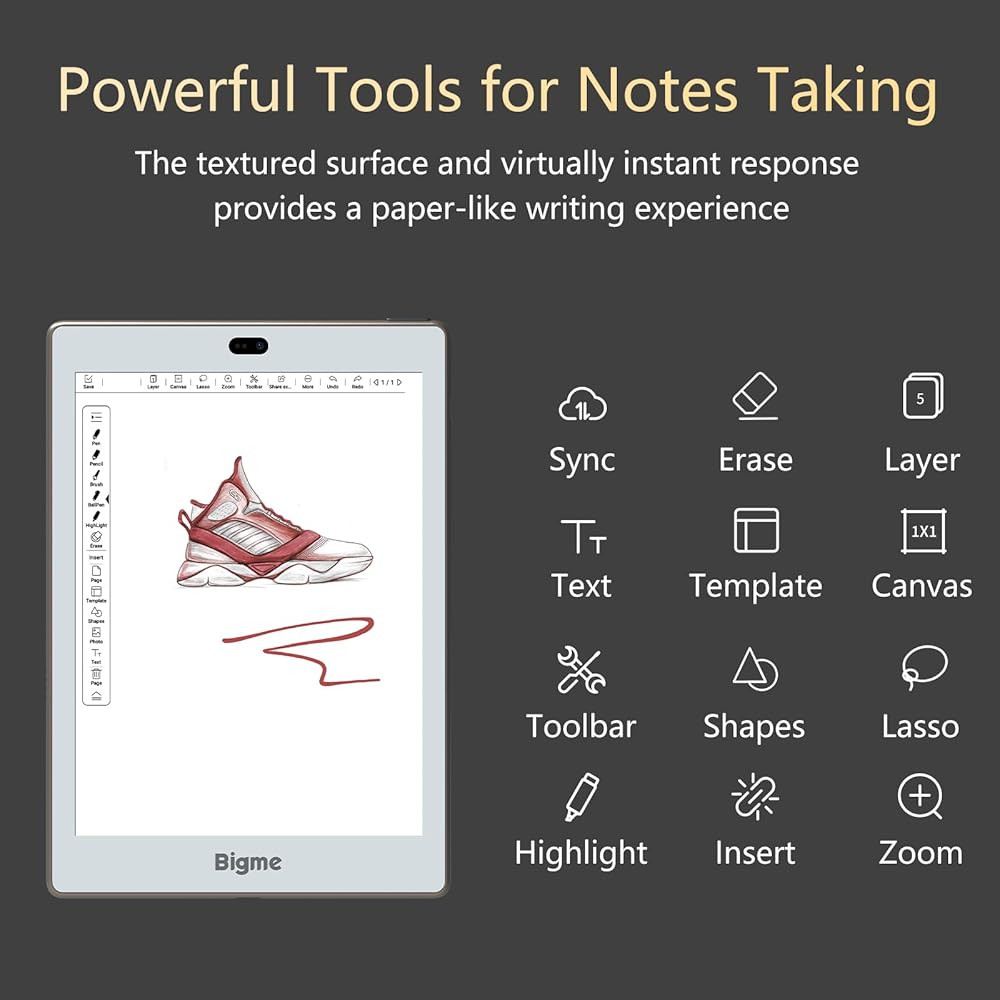 • كتابة سلسة بالقلم الذكي دون أي تأخير. يدعم Bigme S6 Color + Ereader التحكم عن بعد مثل الصفحة لأعلى/لأسفل بواسطة القلم. ويوجد أكثر من 100 قالب ويمكننا إضافة القالب الخاص بنا. كما يتم دعم الكتابة اليدوية العالمية لـ OneNote وKindle. يمكننا تقديم التعليقات التوضيحية على التطبيقات.