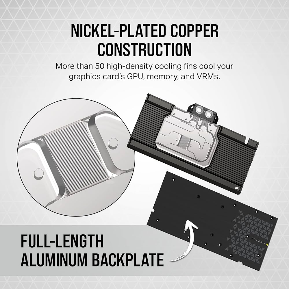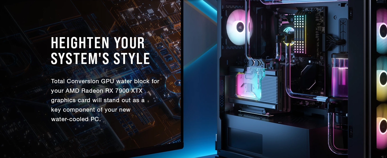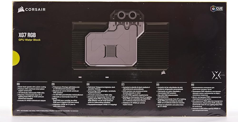 كتلة المياه لوحدة معالجة الرسومات الجرافيكية XG7 RGB RX-Series (7900 XTX) من كورسير عبارة عن كتلة مياه نحاسية تحويل كاملة لبطاقة رسومات AMD راديون™ RX 7900 XTX الخاصة بك. هيكل دقيق من النحاس المطلي بالنيكل المطحون سي ان سي وأكثر من 60 زعانف تبريد عالية الكثافة موضوعة فوق وحدة معالجة الرسومات الجرافيكية تزيد من نقل الحرارة ومساحة السطح، مع غلاف ألومنيوم كامل الطول ولوحة خلفية متضمنة. مسار التدفق الشفاف وإضاءة الفضاء اللوني ار جي بي المنفصلة مع 16 مصباح LED مدمج وقابل للتحكم بشكل فردي يضع بطاقة الرسومات الخاصة بك على الشاشة الكاملة. اجمعها مع وحدة تحكم كورسير اي كيو وبرنامج كورسير اي كيو القوي لتخصيص الإضاءة حسب مزاجك أو مزامنتها مع ألعابك. بدلاً من ذلك، استخدم كيبل محول ARGB المتضمن للتحكم السريع والسهل في اللوحة الأم. مع المواد الحرارية المطبقة مسبقًا والخيوط القياسية G1/4 انش والتعليمات سهلة الاتباع خطوة بخطوة، لم يكن من السهل أبدًا فتح الإمكانات الحقيقية لوحدة معالجة الرسومات الجرافيكية الجديدة.