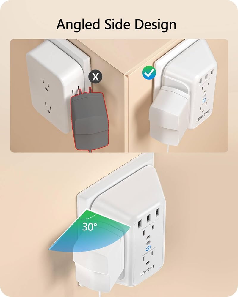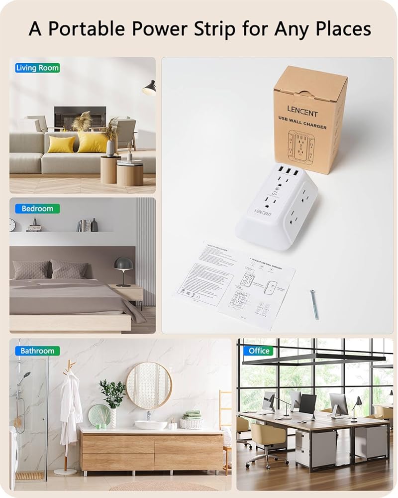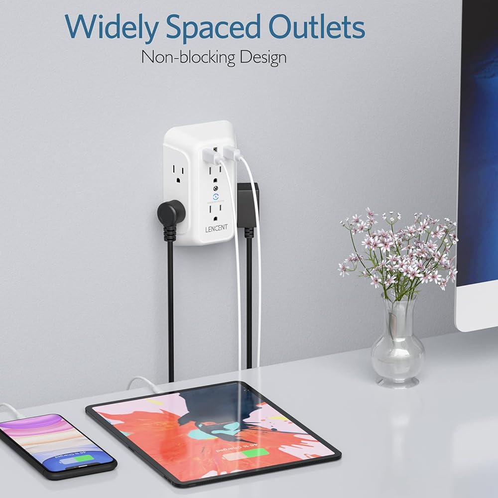 شاحن حائط USB من LENCENT، واقي من زيادة التيار 6 منافذ موسع مع 3 منافذ USB، قابس متعدد لشريط الطاقة 1728J، محول متباعد على نطاق واسع من 3 جوانب، موسع متعدد، صنبور حائط قابل للتركيب لمكتب السفر المنزلي