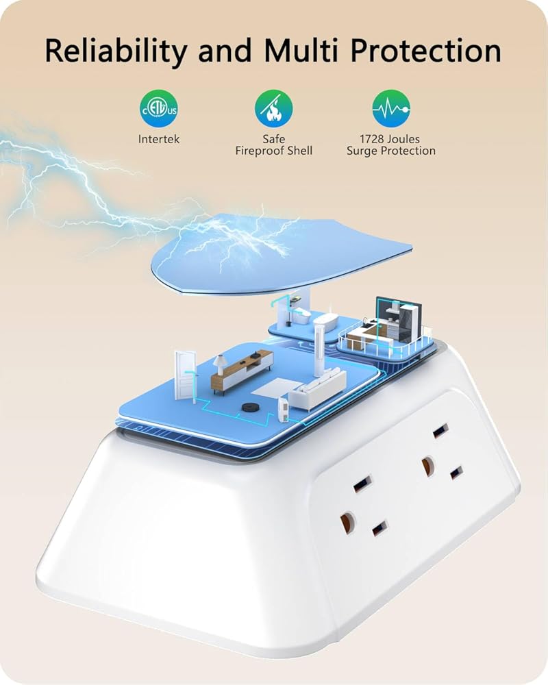【منفذ حماية من زيادة التيار 1728J】- ثلاث دوائر حماية من زيادة التيار، TVS (كابت الجهد الكهربي العابر)، MOV (مكثف أكسيد المعدن)، GDT (أنبوب تفريغ الغاز)، مع سرعة استجابة أقل من 1Ns، والحد الأدنى من قدرة امتصاص الطاقة 1728 جول، الكثير بشكل أسرع وأكثر موثوقية من دائرة الحماية من زيادة التيار MOV التقليدية. (يضيء المؤشر الضوئي ("الحماية من الاندفاع المفاجئ" لإظهار أن أجهزتك محمية)