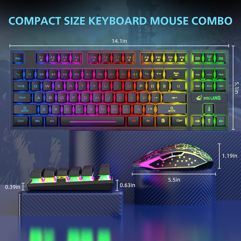 مجموعة لوحة مفاتيح وماوس لاسلكية للألعاب، لوحة مفاتيح غشائية بإضاءة خلفية بألوان قوس قزح 87 مفتاحًا، ماوس لوحة مفاتيح قابل لإعادة الشحن 2.4 جيجا هرتز بقدرة 4000 مللي أمبير في الساعة، مستقبل USB مزدوج الرأس من النوع C للكمبيوتر/الهاتف الذكي/الكمبيوتر المحم