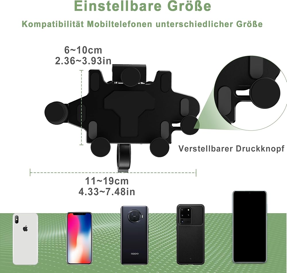 [تطبيق واسع وتوافق]: يمكن تعديل حامل مقود الهاتف الخلوي للدراجة ليناسب قطر المقود، ويتم استخدام حامل الدراجة النارية من سبائك الألومنيوم على نطاق واسع في الدراجات النارية، والدراجات الجبلية، والدراجات الترابية، والدراجات، وعربة الجولف، والسكوتر الكهربائي، إلخ. متوافق مع جميع الهواتف المحمولة مقاس 4.0 بوصة إلى 4.7 بوصة.