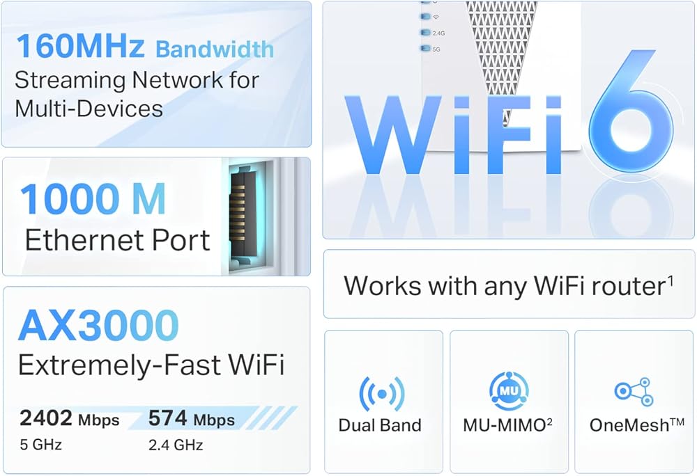 معزز WiFi مع 6 سرعات WiFi: استمتع ببث وألعاب وتنزيل أكثر سلاسة وموثوقية وأكثر مع سرعات WiFi مزدوجة النطاق تصل إلى 3 جيجابت في الثانية (2402 ميجابت في الثانية على 5 جيجاهرتز و574 ميجابت في الثانية على 2.4 جيجاهرتز)
