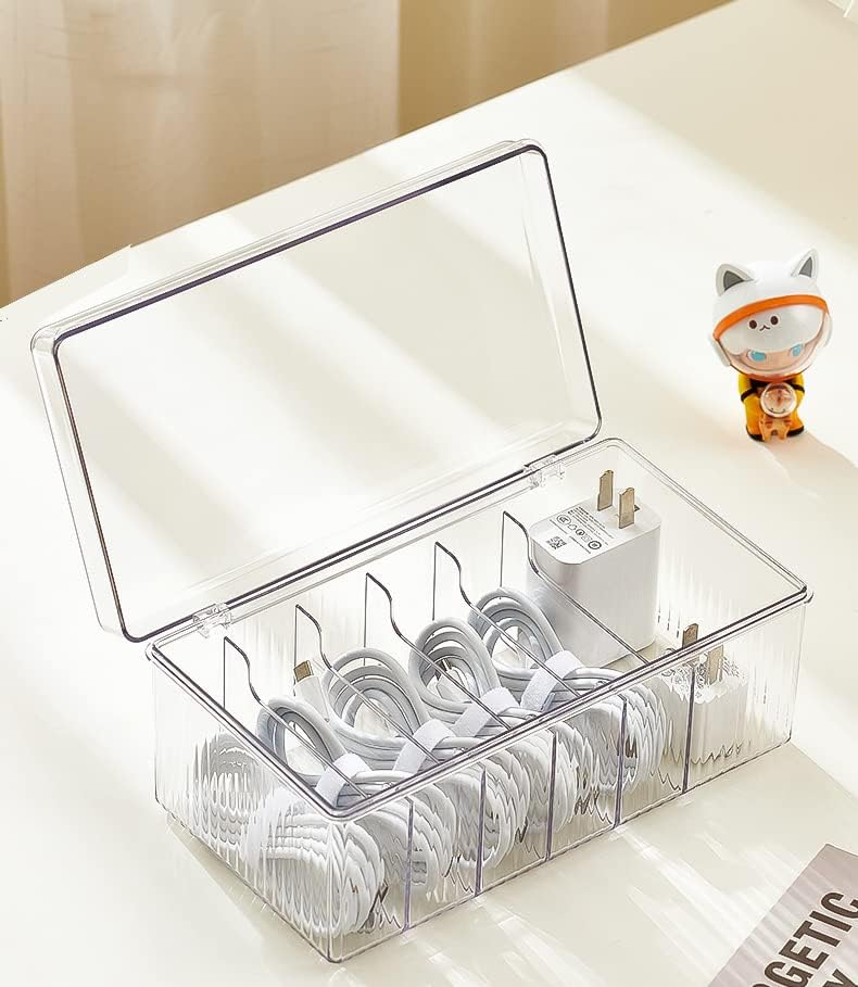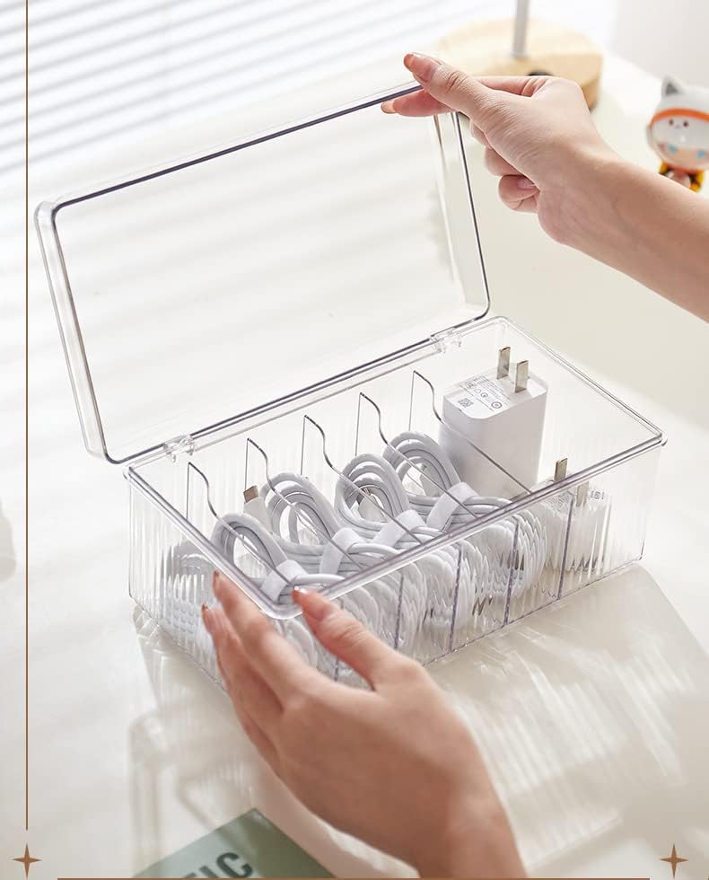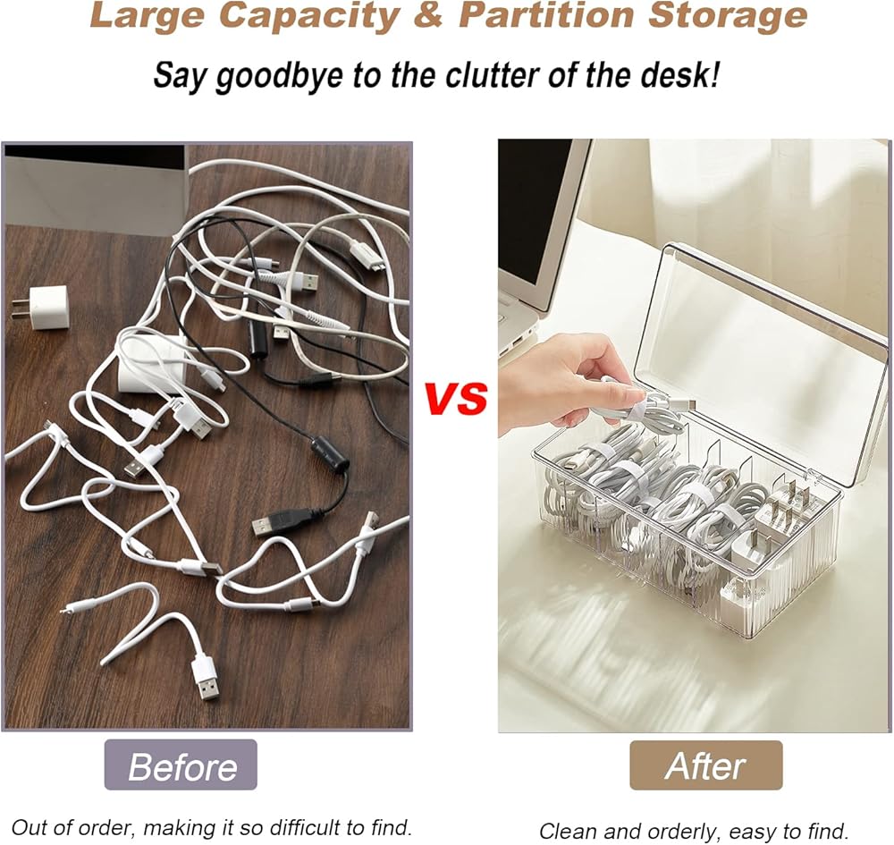 【مساحة مرتبة وموفرة】: قم بتجميع كابلات الشحن المنتشرة في أماكن مختلفة باستخدام روابط الكابلات وتخزينها في صندوق تخزين سلكي شفاف، ووضع علامة عليها بالملصقات. فهو لا يتجنب الفوضى في المكتب فحسب، بل يجعل الاستخدام التالي مريحًا للغاية.