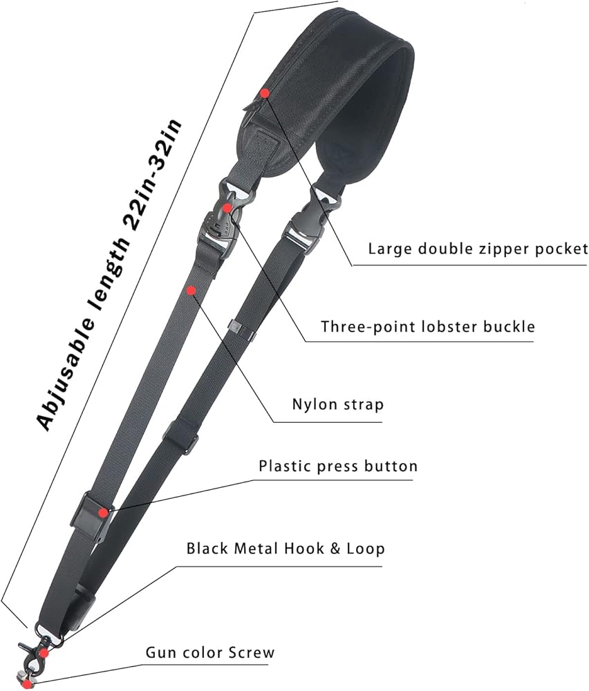 البناء: يتميز حزام الكاميرا هذا بتصميم سحاب مزدوج وجيب كبير الحجم، طول حزام قابل للتعديل مع وسادة كتف مريحة ناعمة غير قابلة للانزلاق.