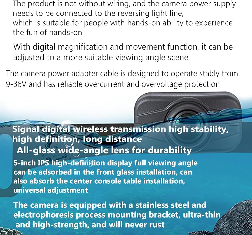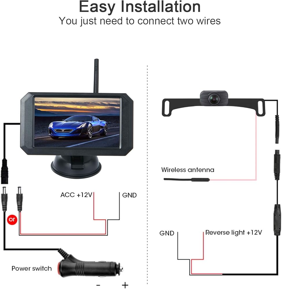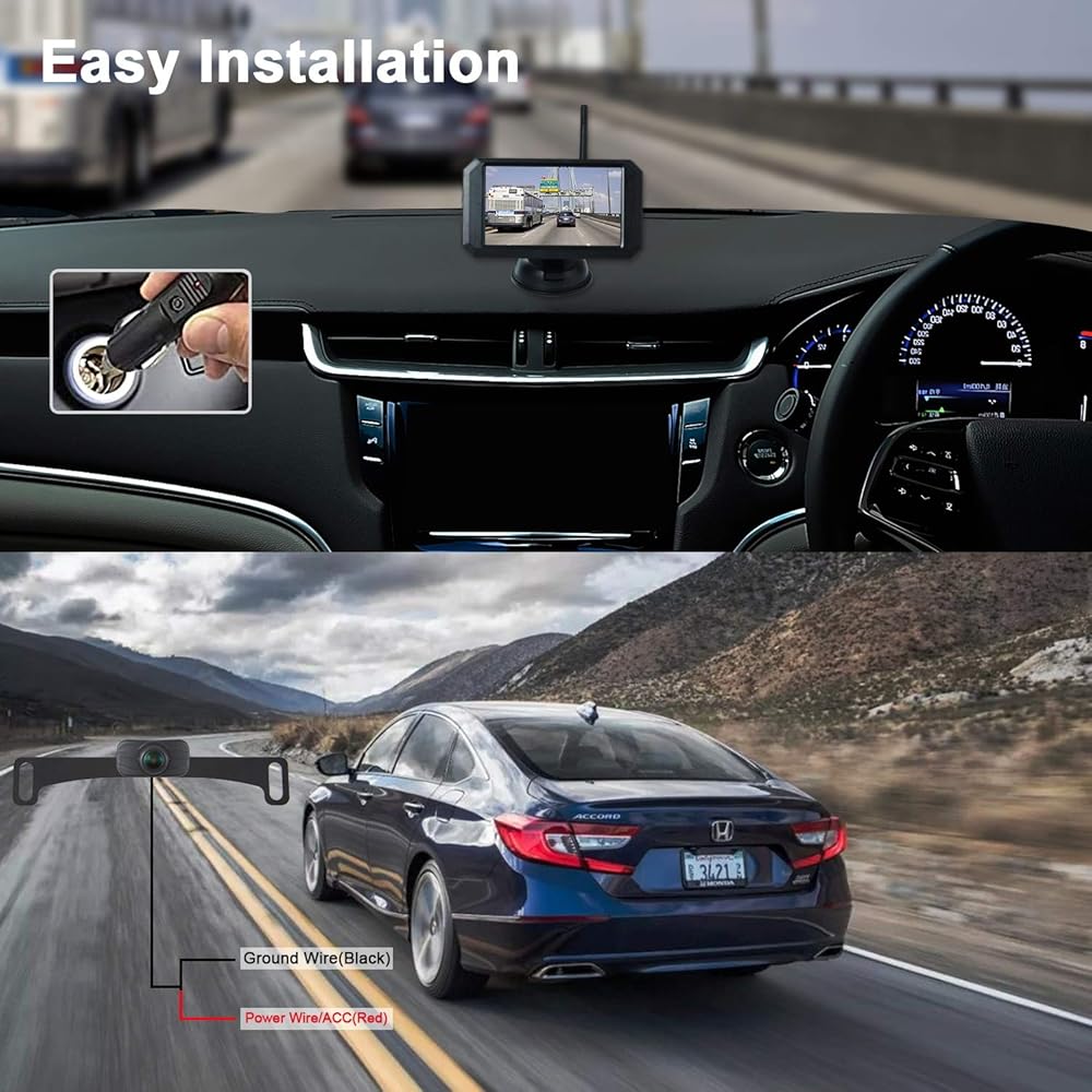 【Easy & Quick Installation】No need to run and hide wires from the camera to the monitor. Just wring the monitor to the cigarette lighter(receiver built-in the monitor), and the camera to the reverse light.You just hook the transmitter and power supply to them, They will transport video signals auto.About the only hard part is getting power to the rear view camera. You need to tap into the backup or tail lights of your vehicle or trailer for 12V or it works with 24V as well.
