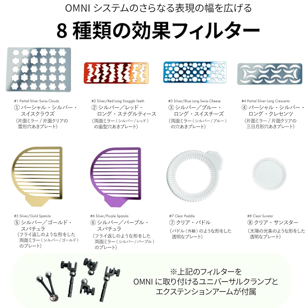 تعمل ثمانية مرشحات للتأثيرات (ثمانية أنواع) على كلا الجانبين بألوان وتشطيبات مختلفة على إنشاء أنماط فريدة للتوهج والظلال المتنوعة والانعكاسات الملونة والبوكيه الأمامي والخلفي.