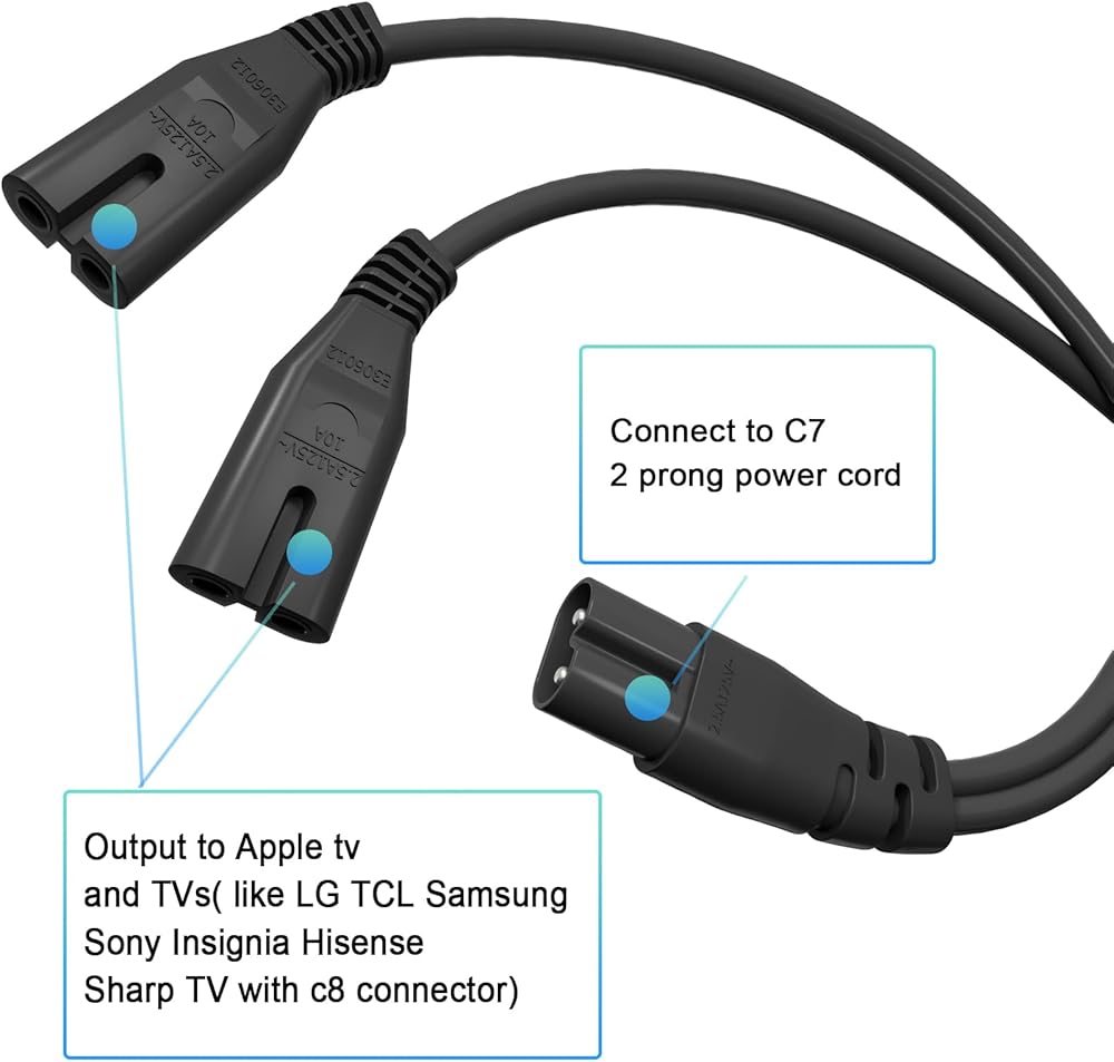 التوافق: كابل طاقة تلفزيون Y Splitter، الحل الأمثل للإعداد الخالي من المتاعب، C8 فردي إلى مزدوج C7، لجميع أجيال Apple TV وApple 4K TV.