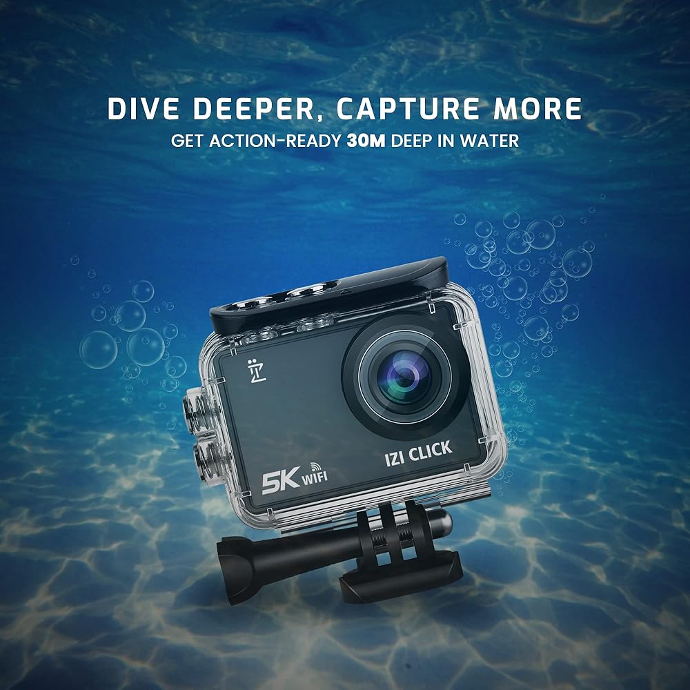 • متين ومقاوم للماء: ايزد Click هو رفيق متين وقوي يتحمل دون خوف أثناء التقاط مغامراتك المثيرة وسط جمال الطبيعة الخلاب. مصممة لتكون مقاومة للماء حتى عمق 100 قدم، مما يجعلها مثالية لاستكشاف المياه العميقة.