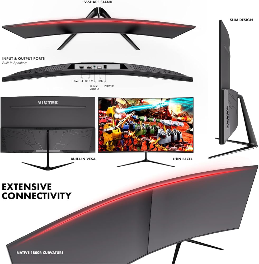 Viotek GNV27CB شاشة ألعاب منحنية 27 بوصة 165 هرتز، دقة Full HD 1080p، متوافقة مع FreeSync، 3 مللي ثانية GTG، تباين 3000:1، 100% sRGB، جاهز VESA، DP، HDMI، مكبر صوت، 3 سنوات بدون بكسلات ميتة
