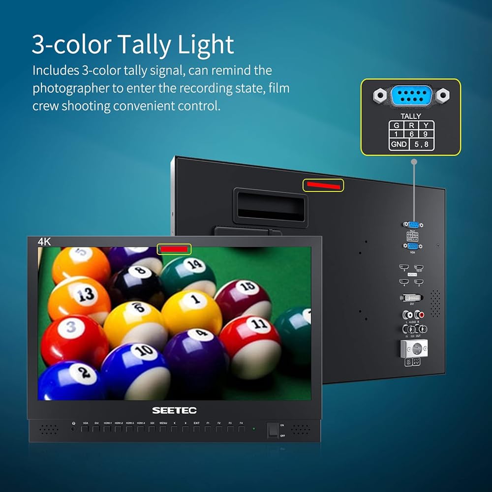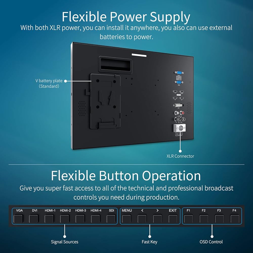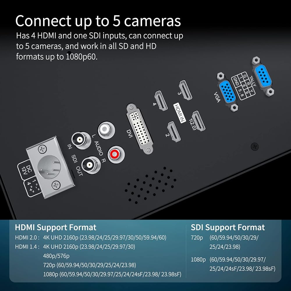 【مراقبة متعددة الرؤية】يحتوي على أربعة مدخلات HDMI بدقة 4K، ومدخل SDI واحد ووضع حلقة، وDVI، وVGA، ويدعم الرؤية الرباعية، والرؤية المزدوجة، ووظائف مراقبة الرؤية الفردية، وشاهد المزيد من مصادر الفيديو على شاشة واحدة.