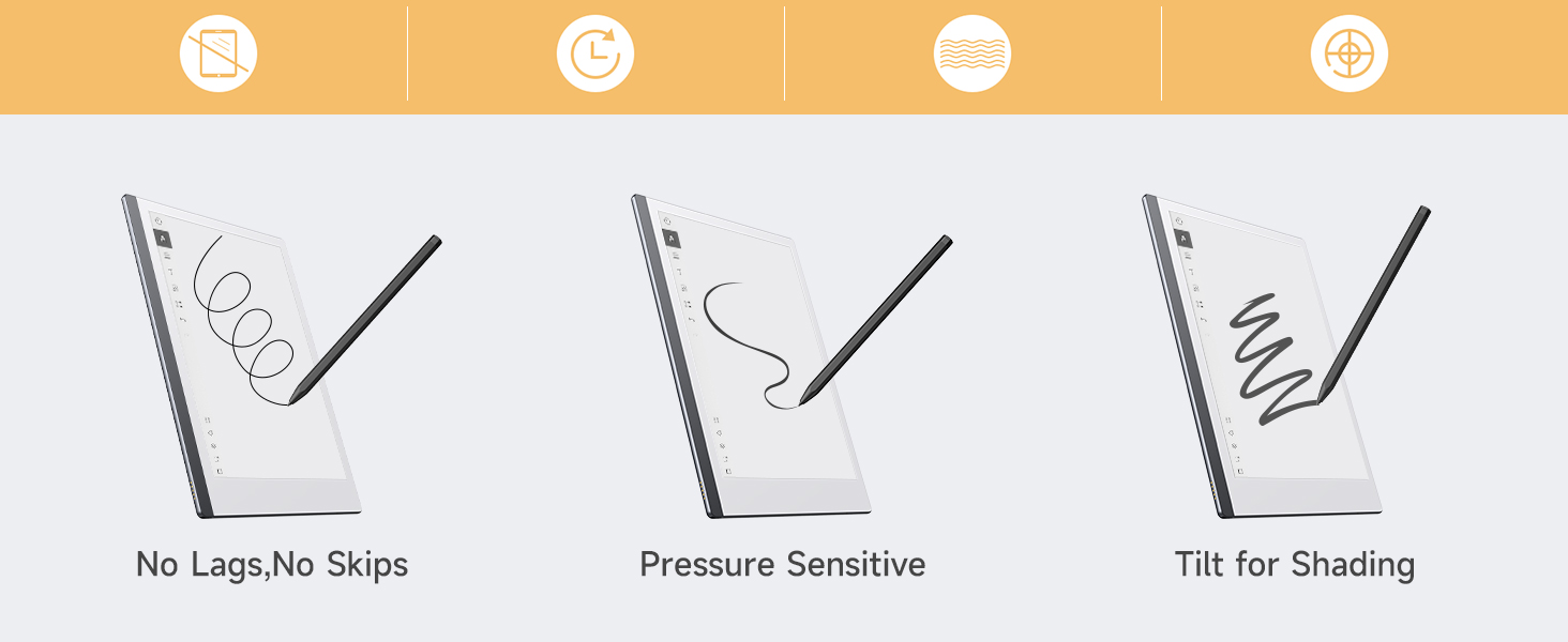 دعم الإمالة وبدون تأخير: مع حساسية الضغط 4096، يجيد الكتابة دون أي تأخير؛ الكتابة بالإمالة تلبي احتياجاتك المختلفة عند الرسم والرسم وتدوين الملاحظات.