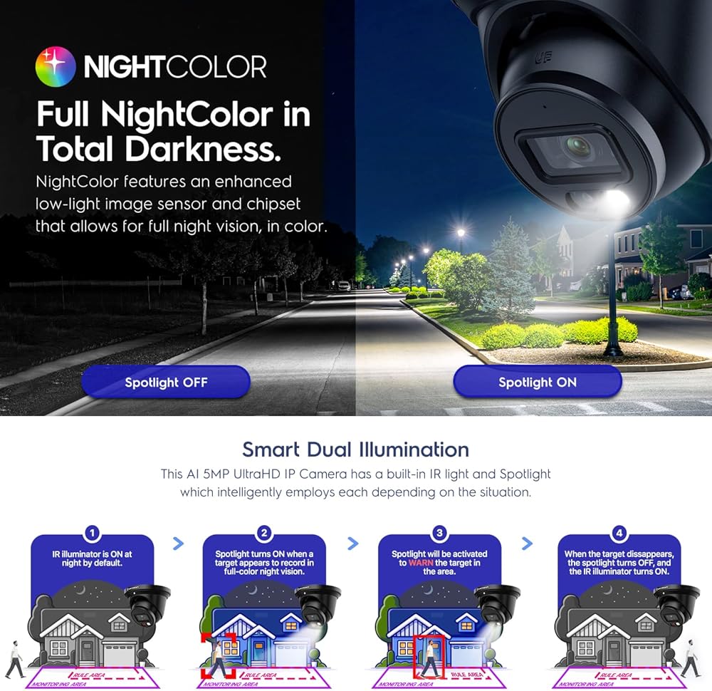 ميزات الذكاء الاصطناعي والإضاءة المزدوجة - تتميز كاميرا AI Turret PoE IP بميزة الكشف عن الإنسان والمركبة، وIVS (Tripwire، كشف التسلل) الذي يطلق حدثًا في أي وقت يعبر فيه الإنسان أو السيارة المنطقة المحددة (يمنع التنبيهات الكاذبة). رؤية ليلية مزدوجة الإضاءة مع إضاءة LED ليلية كاملة الألوان الدافئة/البيضاء ورؤية ليلية بالأشعة تحت الحمراء LED. فيديو بدقة 5 ميجابكسل بمعدل 20 إطارًا في الثانية بزاوية عرض فائقة الاتساع تبلغ 129 درجة. مطلوب حاقن PoE أو مفتاح؛ غير متضمنة، تُباع بشكل منفصل.