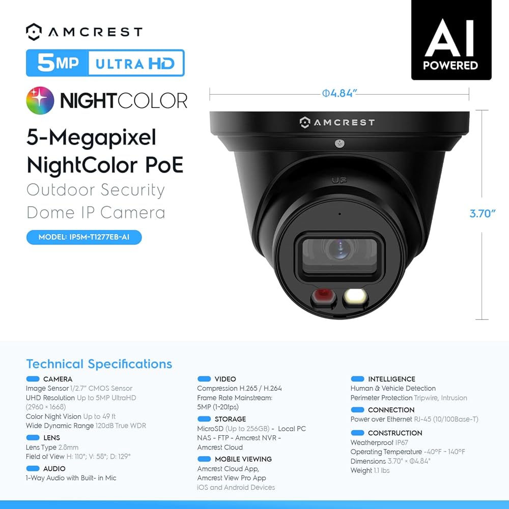 كاميرا Amcrest 2-Pack AI Turret IP PoE مع رؤية ليلية 49 قدمًا، كاميرا IP للأمان في الهواء الطلق، ميكروفون مدمج، اكتشاف الإنسان والمركبة، رادع نشط، 129 درجة FOV، 5 ميجابكسل @ 20 إطارًا في الثانية 2PACK-IP5M-T1277EB-AI