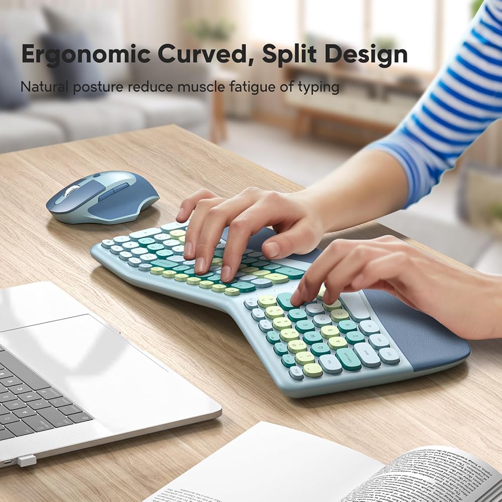 【لوحة مفاتيح مريحة ومريحة】تعزز لوحة المفاتيح المقسمة ذات التصميم المنحني وضع الكتابة الأكثر استرخاءً، مع مساند معصم مبطنة ناعمة لتوفير الدعم وتقليل الضغط على عضلات اليد، وسطح مسند المعصم مصنوع من الجلد متين ومقاوم للبقع وسهل التنظيف، وغير قابل للغسل. ينزلق ويعزز الاستقرار عند الكتابة.