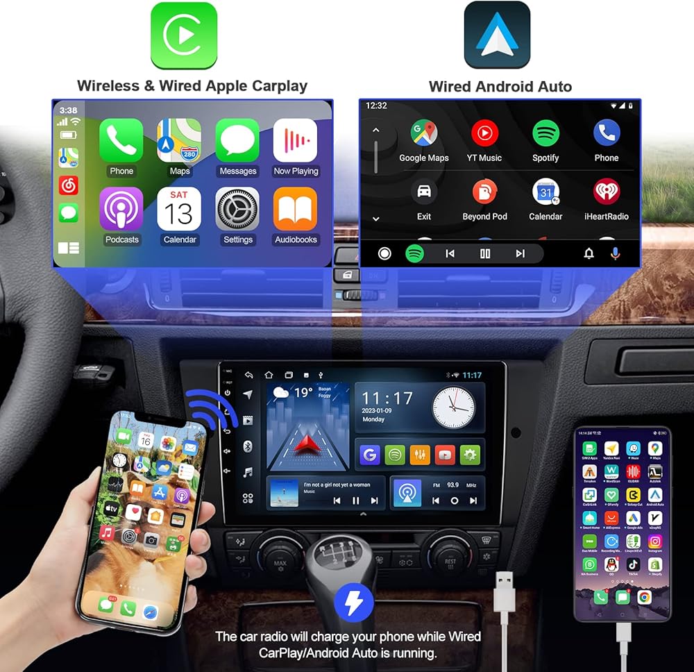 ستيريو سيارة Android 10 Double Din لسيارة BMW 328i 335i 325i (E90/E91/E92/E93)2005-2011 راديو بشاشة لمس 9 بوصة مدمج Carplay لاسلكي/Android Auto/Bluetooth/AUX-in/كاميرا احتياطية للتحكم في عجلة القيادة