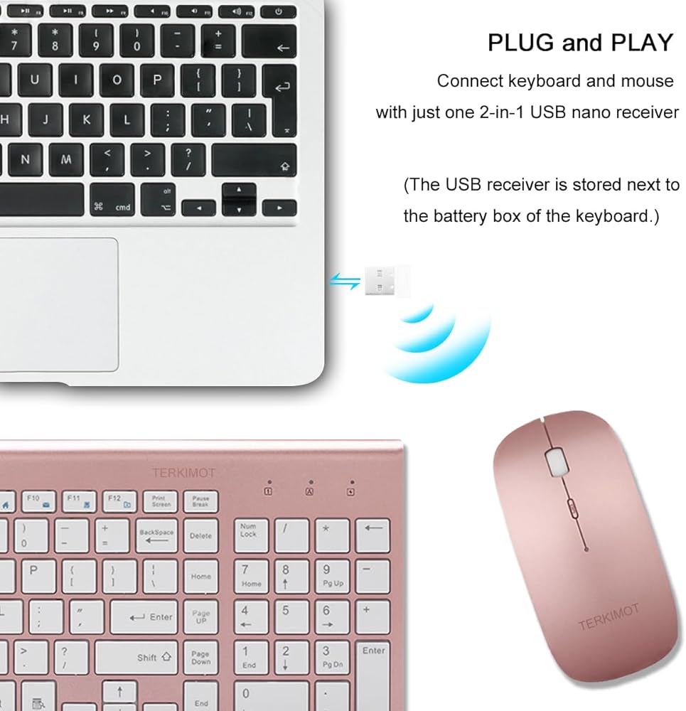 • التوصيل والتشغيل اللاسلكي 2.4G: استمتع بالحرية اللاسلكية مع جهاز استقبال USB سريع واحد فقط الذي يربط لوحة المفاتيح والماوس بجهاز الكمبيوتر الخاص بك، قم بالتوصيل والتشغيل. بدون أي برامج ثم استمتع باتصال لاسلكي قوي وموثوق به يصل إلى 10 أمتار (33 قدمًا) دون أي تأخير أو انقطاع تقريبًا. (يتم تخزين جهاز استقبال USB بجوار حجرة البطارية بلوحة المفاتيح.)