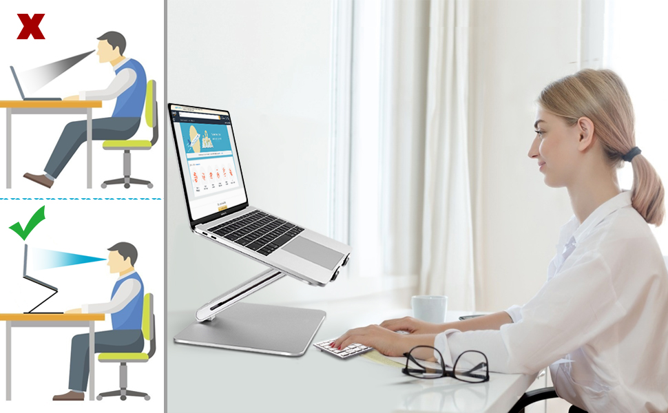 【Durable & Reliable】: The laptop computer stand is made of premium aluminum alloy, it weighs 1.45kg (3.2lbs), supports up to 8kg (17.6lbs) weight on top. When you put the stand in its tallest position, it could raise your laptop 11” at the back and 6.69” in the front from the desktop, with rubber pads on the top surface and front lip to hold your laptop stable in place.