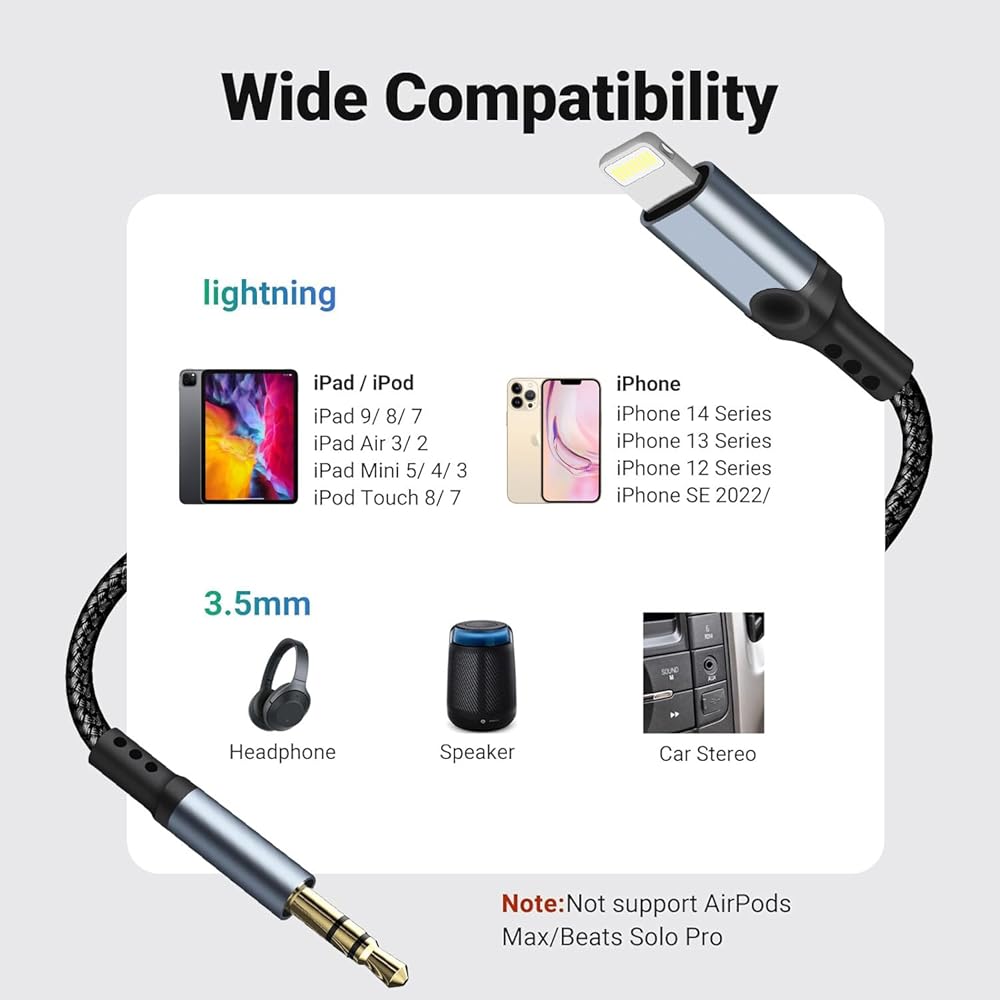 • 【Widely Compatibility】This Lightning to 3.5mm Car Audio Cable compatible with most of the APPLE devices: iPhone 14 / 14 Plus / 14 Pro / 14 Pro Max /iPhone 13 / 13mini / 13 Pro / 13 Pro Max / 12 / 12 mini / 12 Pro / 12 Pro Max / 11 / 11 mini / 11 Pro / 11 Pro Max / XS / XS Max / XR / X / 8 / 8 Plus / 7 / 7 Plus, iPod touches 6th Generation, iPad Mini / iPad Air / iPad Pro. (NOTE: Doesn't compatible with Airpods Max, Beats Solo Pro, 2018 iPad Pro 12.9" , iPad Pro 11", and iPad air 2020 gen4).