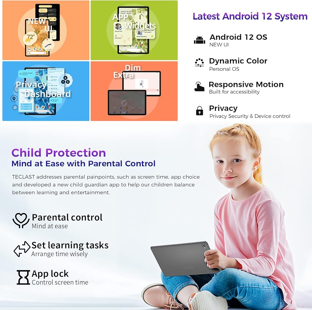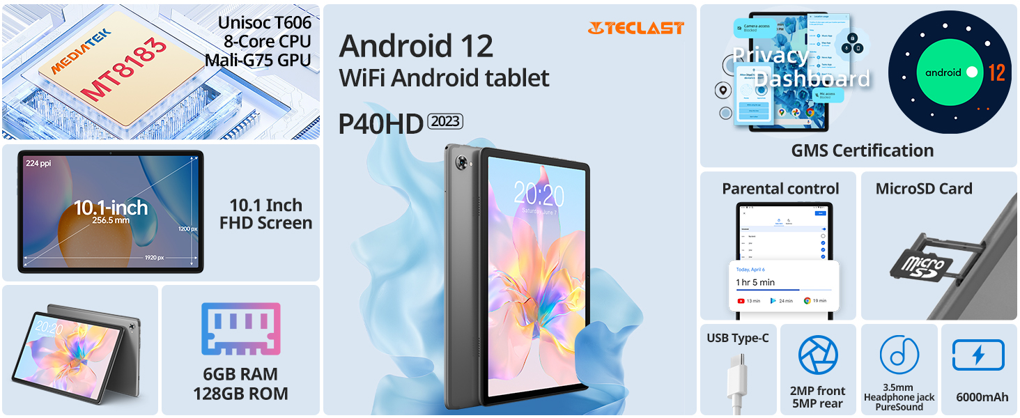 【جهاز لوحي Android 12 + شهادة GMS】تم تجهيز طراز TECLAST P40HD Android 12 Tablet Wi-Fi بنظام تشغيل ذكي Android 12، مع التركيز على الخصوصية والأمان، وواجهة مستخدم تكيفية جديدة تمامًا وأداء محسن. يوفر أداء أسرع وأكثر كفاءة للنظام للأجهزة اللوحية. لقد اجتاز الكمبيوتر اللوحي P40HD مقاس 10.1 بوصة شهادة GMS من Google. لا يمكنك فقط تجربة خدمات Google المستقرة والسلسة، ولكن يمكنك أيضًا تثبيت تطبيقات الطرف الثالث المفضلة لديك مثل LINE/YouTube. يدعم الجهاز اللوحي الذي يعمل بنظام Android 12 الاتجاه الأفقي، والتشغيل متعدد النوافذ، ووضع القراءة، ووضع حماية العين، والوضع المظلم، وما إلى ذلك. تعمل الوظائف الإضافية على تحسين تجربة جهازك اللوحي