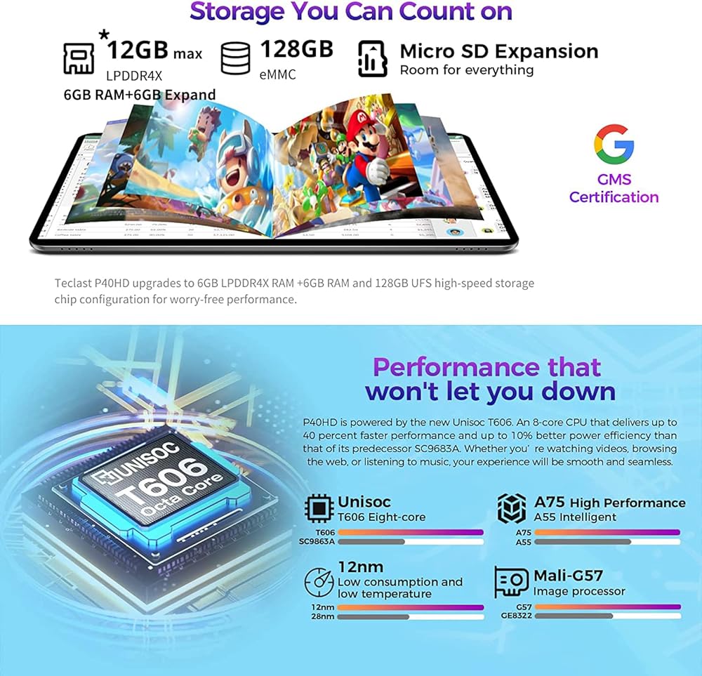 【12 جيجابايت (6 جيجابايت + 6 جيجابايت) ذاكرة الوصول العشوائي + 128 جيجابايت ذاكرة الوصول العشوائي، جهاز لوحي 8 النواة 】Teclast 10.1 بوصة أندرويد اللوحي مع 12 جيجابايت (6 جيجابايت + 6 جيجابايت توسيع) ذاكرة الوصول العشوائي + ROM 128 جيجابايت، يمكن تشغيله بسلاسة أكبر ويمكنك تشغيل التطبيقات بسرعة والاستمتاع بها دون الحاجة إلى ذلك. الضغط الناتج عن نفاد مساحة التخزين. اعتماد وحدة المعالجة المركزية Unisoc T606 8 النواة، A75x2+A55x6 الأساسية، يمكن أن تلعب ألعاب الهاتف المحمول الشهيرة. من خلال الجمع بين ذاكرة ROM سعة 128 جيجابايت وبطاقة MicroSD (TF) للوحدة الرئيسية، يمكن توسيع الذاكرة حتى 1 تيرابايت (تنسيق FAT32، يُباع بشكل منفصل)، ويمكنك تنزيل مقاطع الفيديو الغنية والكتب الإلكترونية والألعاب والموسيقى والمزيد مجانًا