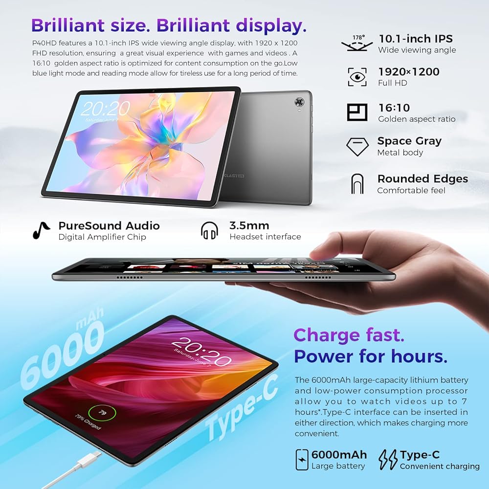 【1920*1200 FHD IPS و10.1 بوصة+Widevine L1】تعتمد الشاشة مقاس 10 بوصة لجهاز Android اللوحي شاشة عرض داخلية بدقة 1920*1200 عالية الدقة بالكامل، ومزودة بشاشة IPS LCD وزاوية رؤية واسعة وعرض جيد للألوان. سمك الجهاز اللوحي مقاس 10 بوصة رفيع للغاية، 8.4 ملم فقط. مزيج من الروح الفريدة والمواد غير اللامعة يجعلها تشعر بحالة جيدة جدًا في اليد. استمتع بمقاطع الفيديو بمزيد من الحرية بفضل شاشة العرض ذات 300 نيت ووضع حماية العين. كما أنه يدعم عرض الشاشة لاسلكيًا، ويتصل بشاشة تلفزيون، ويستمتع بالأفلام والموسيقى مع مكبرات الصوت المزدوجة. كما أن P40HD جاهز لـ Widevine L1. يمكنك مشاهدة مقاطع الفيديو بأعلى جودة. ملحوظة: تشغيل فيديو Netflix HD غير مدعوم