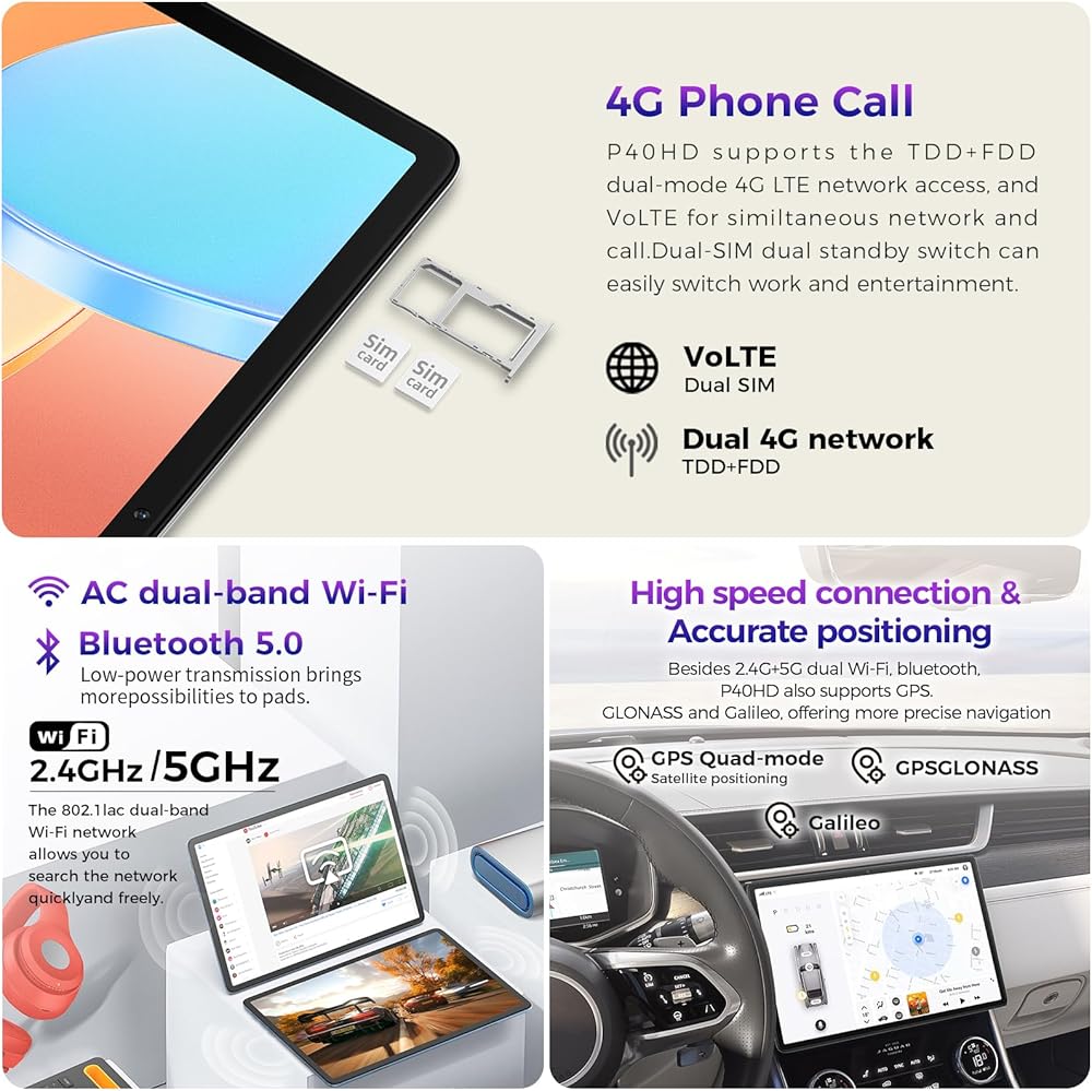 【5G/2.4G Dual WIFI + 4G Cellular+GPS】جهاز Android اللوحي P40HD مزود بفتحة SIM تدعم الجيل الرابع من الاتصالات المحمولة 4G/LTE، ويدعم مكالمات شبكة TDD+FDD 4G/الوصول إلى الإنترنت. ملحوظة: الكمبيوتر اللوحي P40HD مقاس 10 بوصات يعمل بنظام Android 12 يدعم فقط بعض عمليات الاتصال ونطاقات التردد في UAS. إذا كنت بحاجة إلى استخدام وظيفة 4G، يرجى الشراء بعناية. يمكن لهذا الجهاز اللوحي الذي يعمل بنظام Android الاتصال بشبكة WiFi ذات نطاق 5G/2.4G. كما أنه يدعم الاتصال اللاسلكي عبر تقنية Bluetooth 5.0. يمكن الحصول على معلومات الموقع من خلال نظام الملاحة GPS المدمج. يمكن تأكيد معلومات الموقع الدقيقة عن طريق نظام تحديد المواقع عبر الأقمار الصناعية GPS/Galileo/GLONASS/QZSS