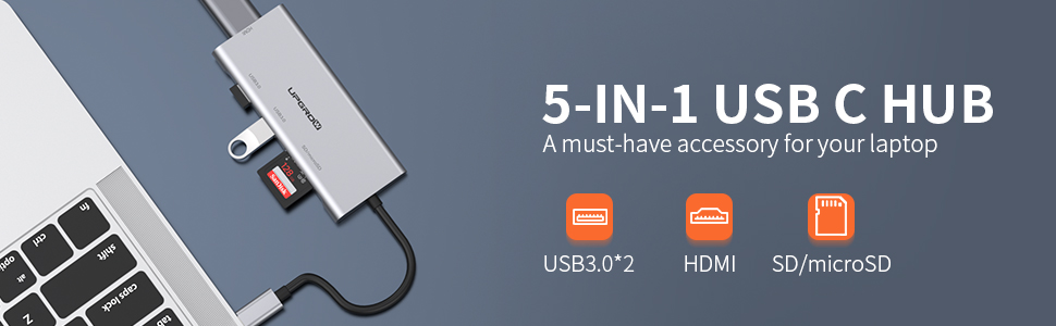 موزع USB C، محول USB C 5 في 1، مع 4K USB C الى HDMI وقارئ بطاقات SD وmicroSD ومنفذي USB 3.0 لماك بوك برو 2020/2019/2018 وايباد برو 2020/2019 وبكسل بوك واكس بي اس وغيرها