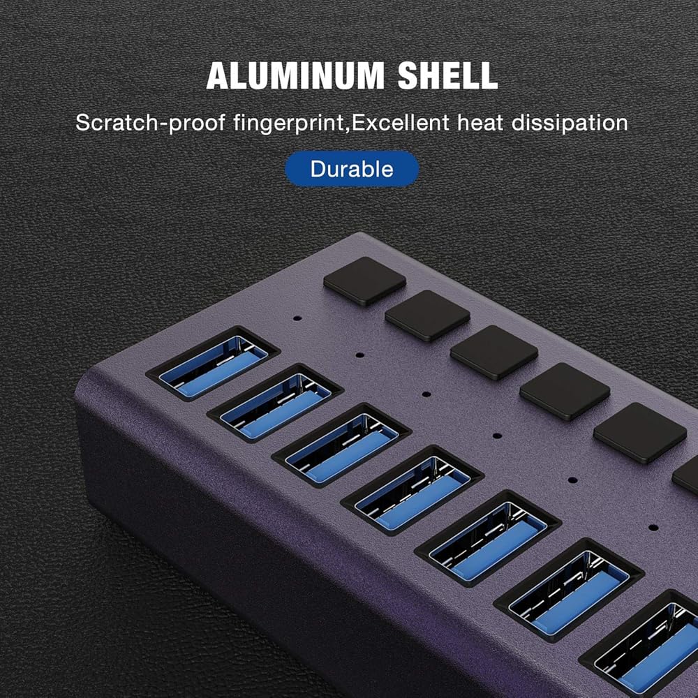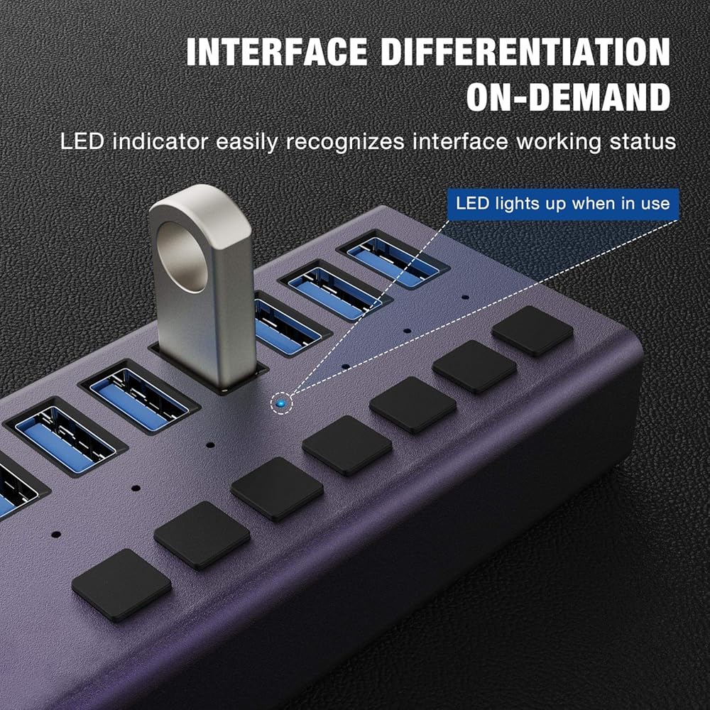 • مفاتيح تشغيل/إيقاف فردية وأضواء: ​​يكون هذا المحور المكون من 16 منفذًا مزودًا بمفاتيح تشغيل وإيقاف مدمجة مع مؤشرات LED لكل منفذ. من خلال القدرة على تشغيل أو إيقاف تشغيل منفذ USB المنفصل دون فصل الجهاز، تتيح لك مصابيح LED الزرقاء معرفة حالة العمل بسهولة.
