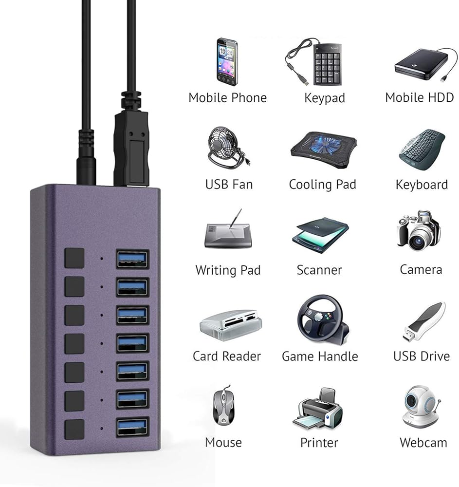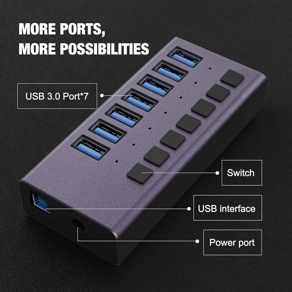 موزع USB 3.0 - موزع USB يعمل بـ 7 منافذ، محور شحن USB بقدرة 36 ​​وات مع مفاتيح تشغيل/إيقاف فردية ومحول طاقة 12 فولت/3 أمبير وإضاءة للكمبيوتر الشخصي والكمبيوتر المحمول والكمبيوتر المحمول والأقراص الصلبة المحمولة ومحرك الأقراص المحمول والمزيد (بنفسجي)