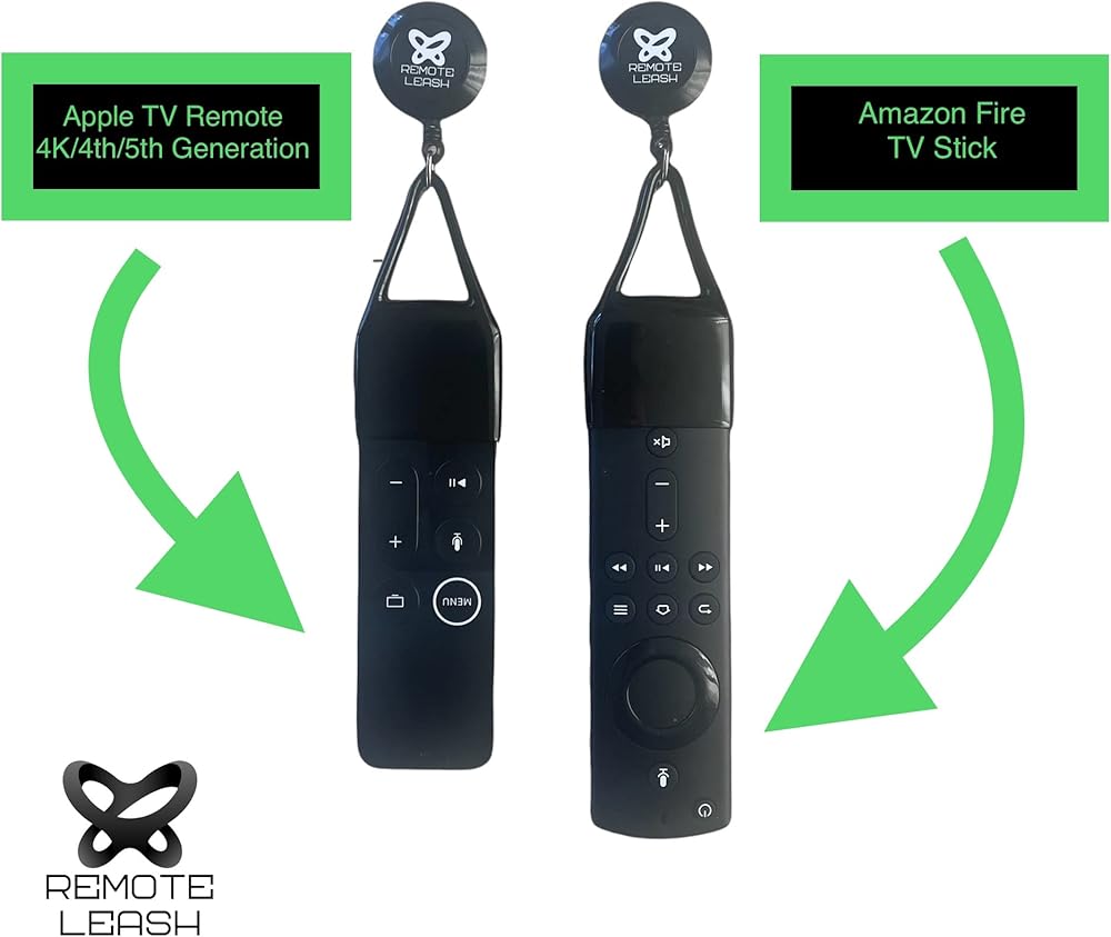 This Apple Tv / Fire Stick remote leash retractable holder is compatible with Apple TV 4k/4th/5th generation and Amazon Fire TV Stick remotes (Not older Apple TV's). We use sturdy 3m backing to easily attach to almost any surface and the retractable cord extends 2 feet.
