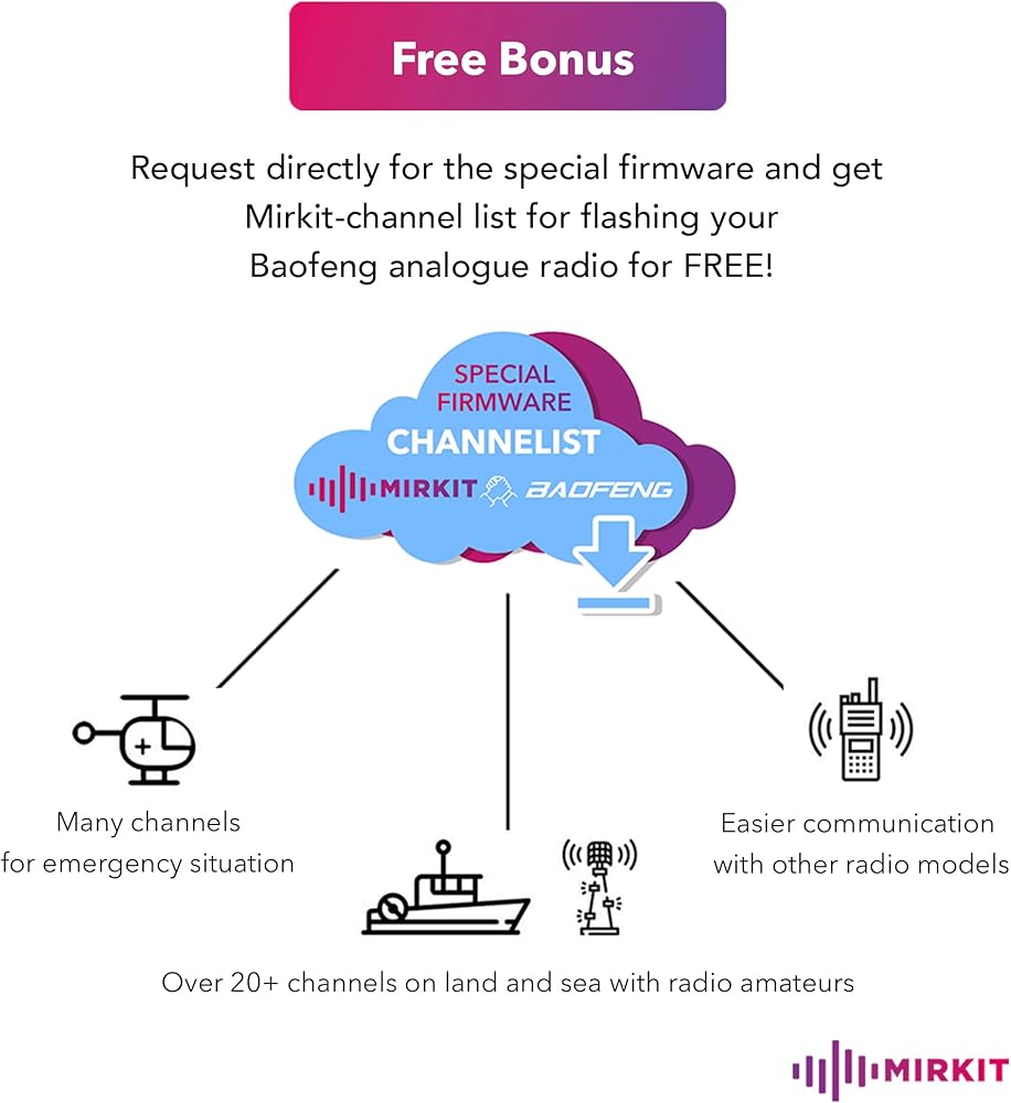 • ✔️ البرامج الثابتة الخاصة: عزز تجربة راديو Baofeng Two Way. اطلب البرامج الثابتة الخاصة بنا من راديو Mirkit مجانًا.
