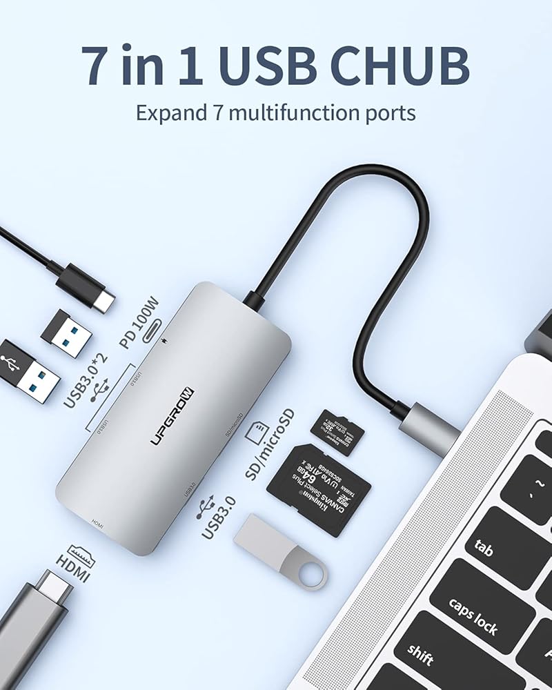 موزع يو اس بي سي 7 في 1: موزع من النوع C متوافق مع 3 * يو اس بي 3.0، 1 * 4 كيه عند 30 هرتز، HDMI، 1 * توصيل الطاقة وقارئ بطاقة TF/SD ، يلبي جميع طلبات أجهزة الكمبيوتر المحمولة من النوع C