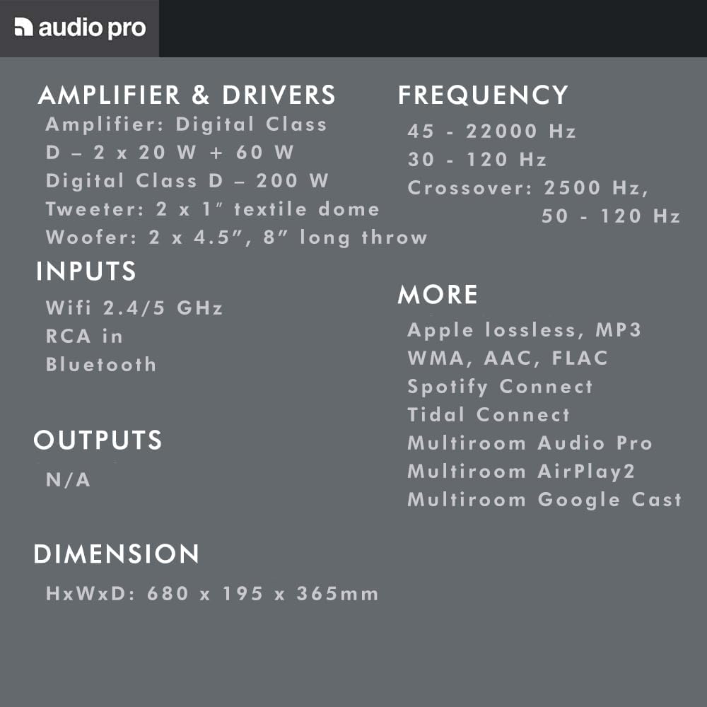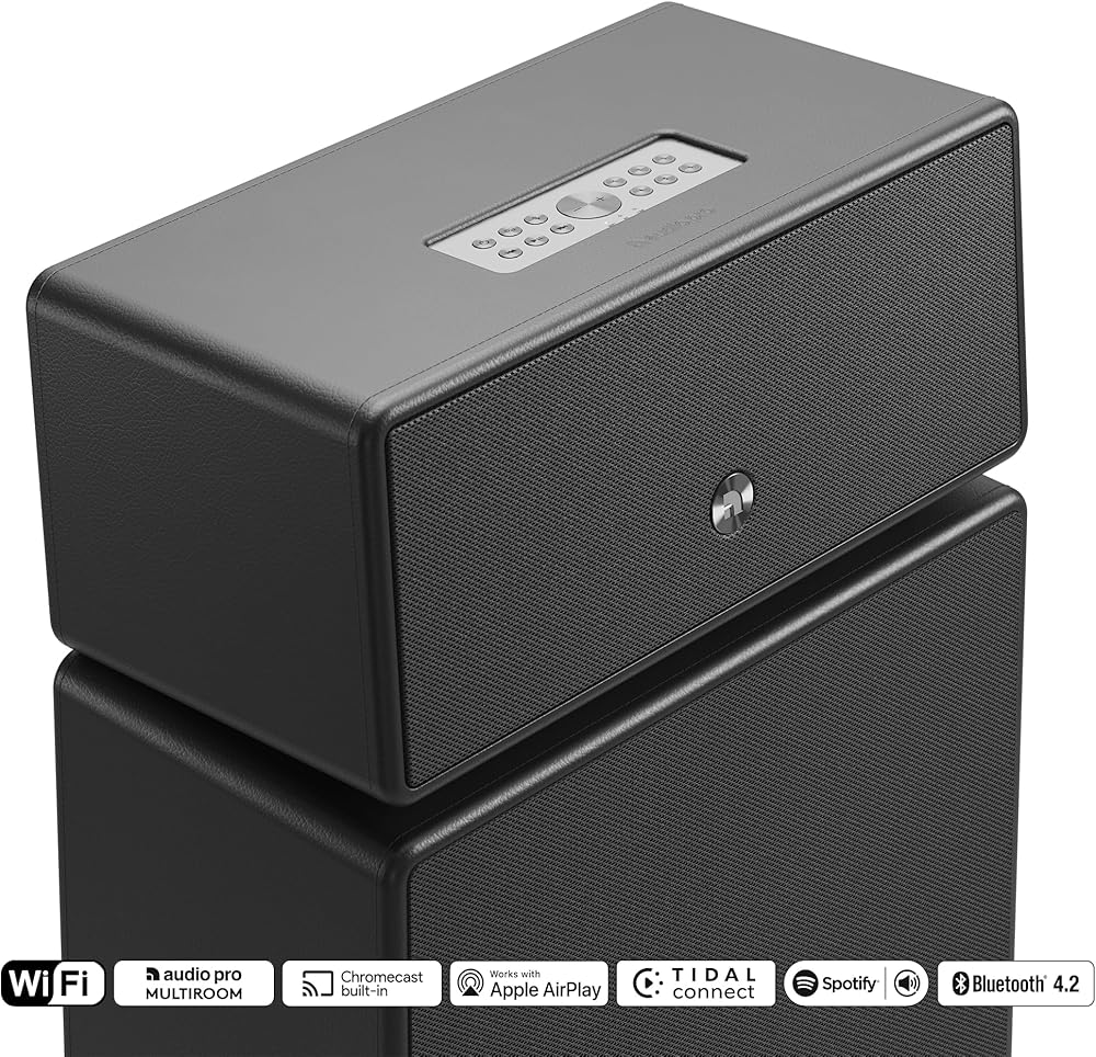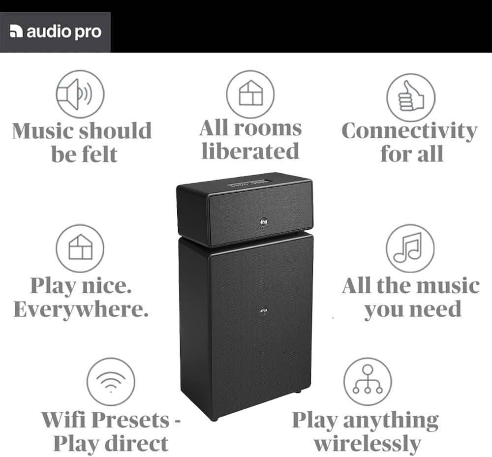 تشغيل أي شيء: يدعم نطاقي 2.4 جيجا هرتز و5 جيجا هرتز من شبكة WiFi المنزلية! اتصال لاسلكي باستخدام جهاز Chromecast المدمج، أو الاتصال عبر AudioPro multiroom وAirplay وSpotify Connect وBluetooth. يمكنك أيضًا الانتقال إلى الطريقة التقليدية باستخدام إدخال كبل RCA. يمكنك أيضًا توصيل القرص الدوار الخاص بك والتشغيل لاسلكيًا مع المزيد من مكبرات الصوت.