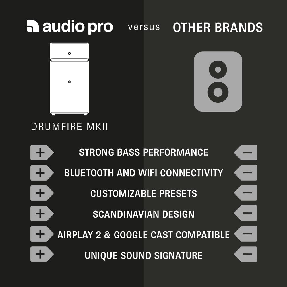 حفلة موسيقية في منزلك: نظرًا لأن Drumfire عبارة عن مكبر صوت متعدد الغرف يوفر صوتيات HiFi نقية، مع صوت جهير عميق يمكن التحكم فيه وارتفاعات متموجة، يمكنك تجميع اثنين منهم في إعداد يسار/يمين وسوف تكون الحفلة الموسيقية على المسرح في منزلك، حرفيًا .